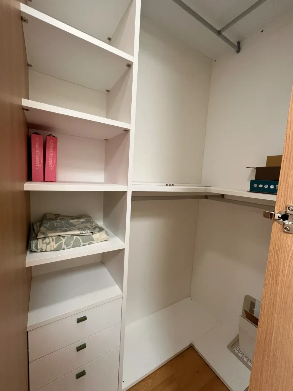 Uno degli elementi distintivi di questa cameretta è la cabina armadio, che offre ampio spazio per organizzare vestiti e accessori grazie alla cassettiera interna, ai ripiani e alle luci integrate. La finitura in rovere aggiunge un tocco di calore all’ambiente, mentre le ante bianche mantengono l’estetica pulita e luminosa.