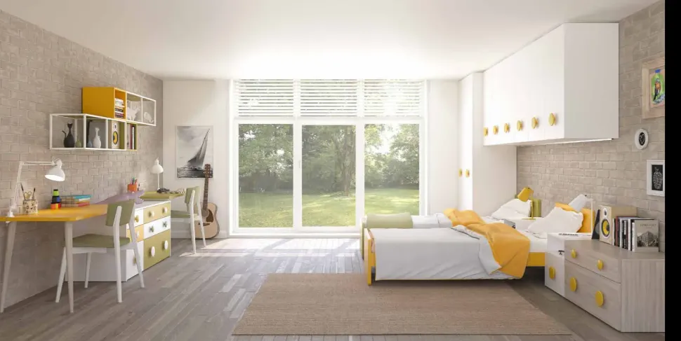 Cameretta completa per bambini e ragazzi in legno dotata di due letti SWEET BASIC giallo ocra e verde giada, materassi esclusi, e comodini OPEN. Scrittoi SWEET in appoggio su cassettiera colorata e sedie ELLEN. Pensili metallo FRAME e KUBOCOLOR. Armadio a otto ante battenti OPEN. Le finiture sono a scelta, i tempi per la fornitura vanno dai 40/50 giorni lavorativi e il prezzo dell’intera composizione è di 3.600,00. Consegna compresa nel prezzo, montaggio escluso.
