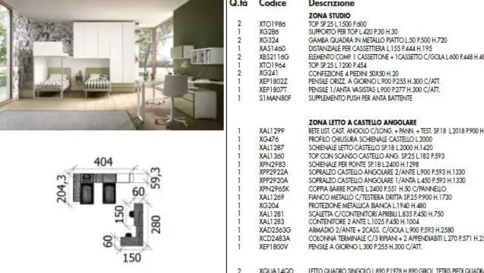 Cameretta con soppalco dotata di tre letti in legno con reti a doghe comprese, dallo stile nordico, studiata per tre bambini che ottiene il massimo dallo spazio, le sue forme sono accoglienti e creano un piacevole dinamismo a tutto l ambiente. I mobili hanno linee essenziali e pulite qui in Larice Sbiancato e Felce, colori perfetti per allontanare lo stress e riposare bene. La cameretta dei bambini si presta molto bene a mix di soluzioni in finitura legno con tocchi di colore: gli scrittoi posizionati perpendicolarmente creano un perfetto angolo studio grazie alle loro linee semplici e pulite. La cassettiera è molto capiente grazie ai doppi cassetti e cestoni. Armadio con cinque ante e vano a giorno con tre ripiani. Materassi e sedie non compresi, le finiture dei materiali sono personalizzabili. Su ordinazione, i tempi per la consegna vanno dai 50 ai 60 giorni lavorativi e la nostra offerta è di Euro 3.800, 00 . Il montaggio è su richiesta e la consegna disponibile in tutta Europa. Il letto a castello è un idea perfetta per vivere la cameretta in modo originale e una soluzione efficiente per risparmiare spazio. È divertente e sicuro grazie a scale studiate perché i bimbi salgano tranquilli, protezioni per non rischiare di cadere e meccanismi a ribalta per riassettare il letto facilmente. Il letto con soppalco permette di adattare l arredo ad ogni nuovo evento di crescita della famiglia, si presta ad essere spazio gioco o zona scrivania, lasciando sempre aperta la possibilità del secondo letto. Più spazio, più gioco! Camerette prodotte interamente in Italia con materiali certificati e garantiti che rispettano i più rigorosi standard: qualità e sicurezza per la salute dei vostri bambini. Inoltre potrai scegliere tra un’infinita varietà di colori e di composizioni, affidandoti ad un personale esperto e qualificato che sarà in grado di guidarti nelle scelte e di indicarti le soluzioni migliori per i tuoi bambini.