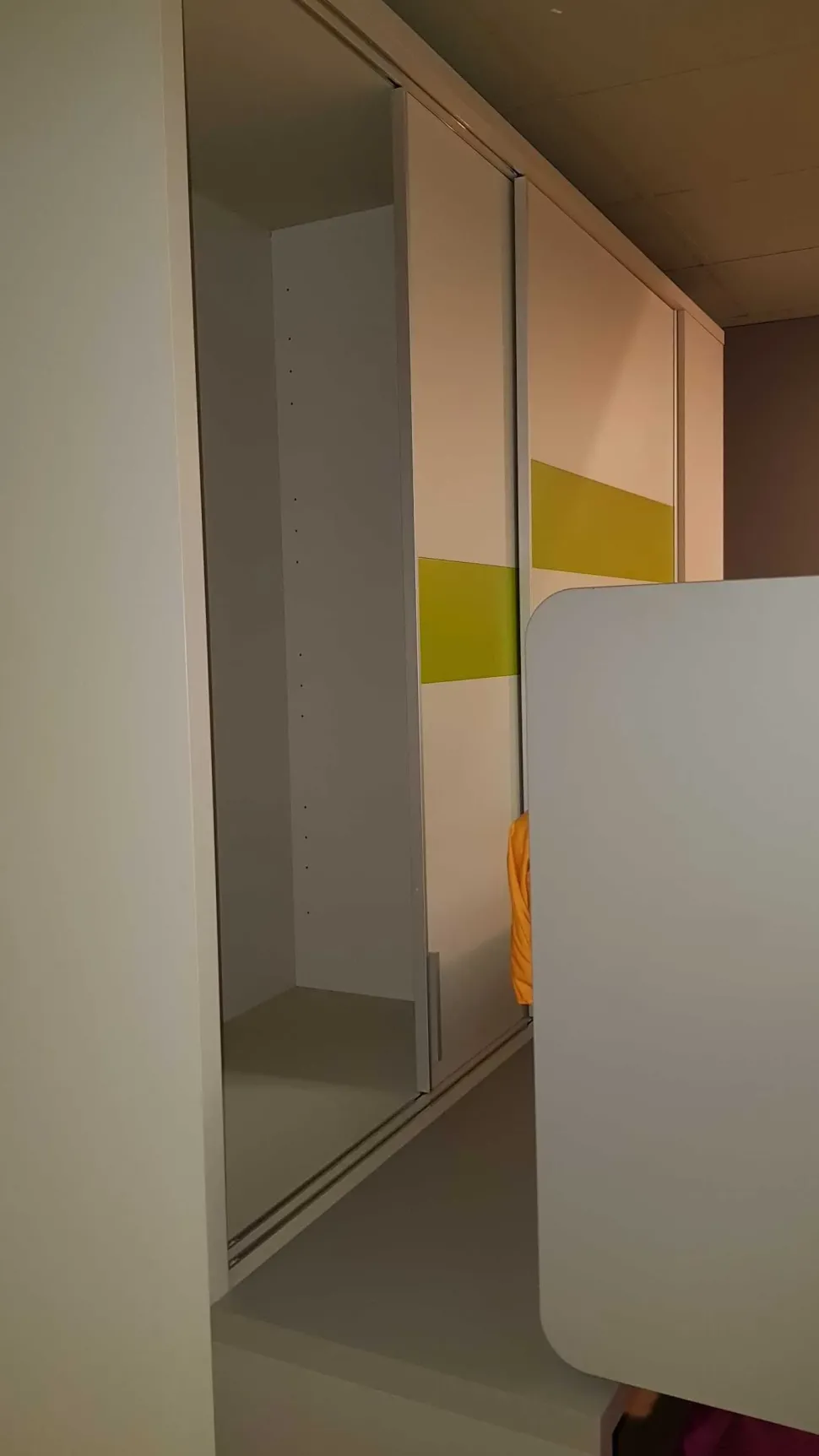 L’armadio è composto da n.2 ante scorrevoli con inserti laccato opaco verde acido ed una colonna con anta battente, può essere attrezzato internamente a piacimento con ulteriori ripiani o altro.