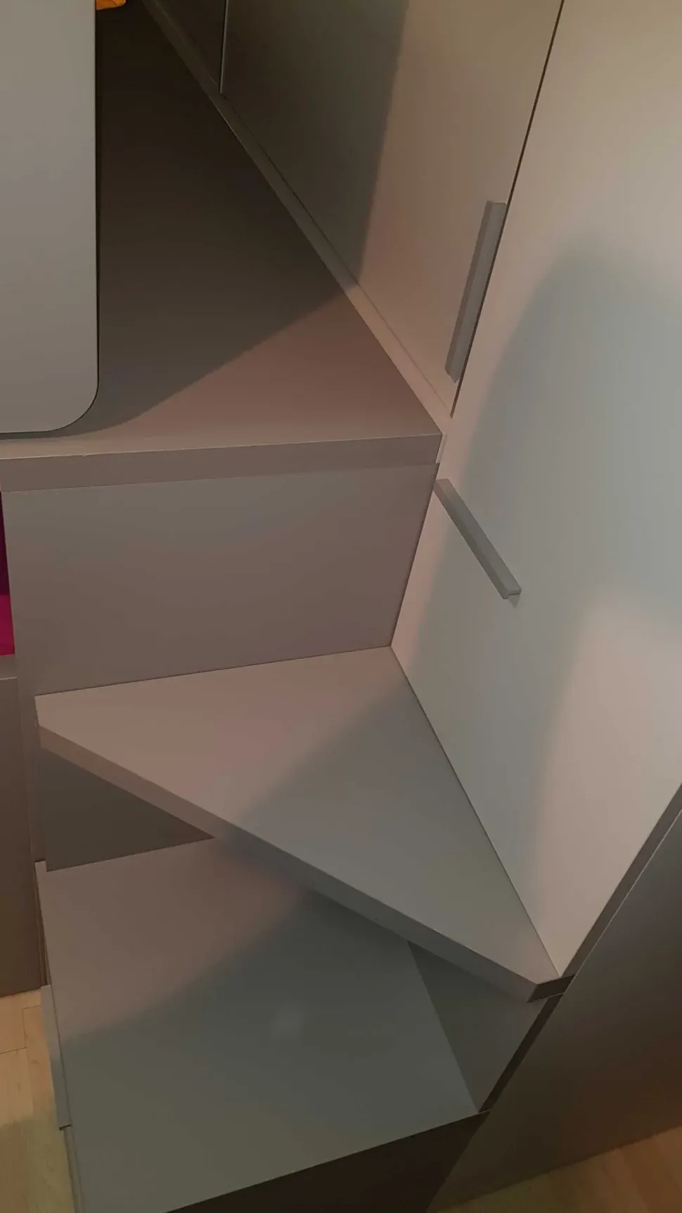 La scaletta laterale consente di salire comodamente sul soppalco ed è corredata di un cassettone estraibile.