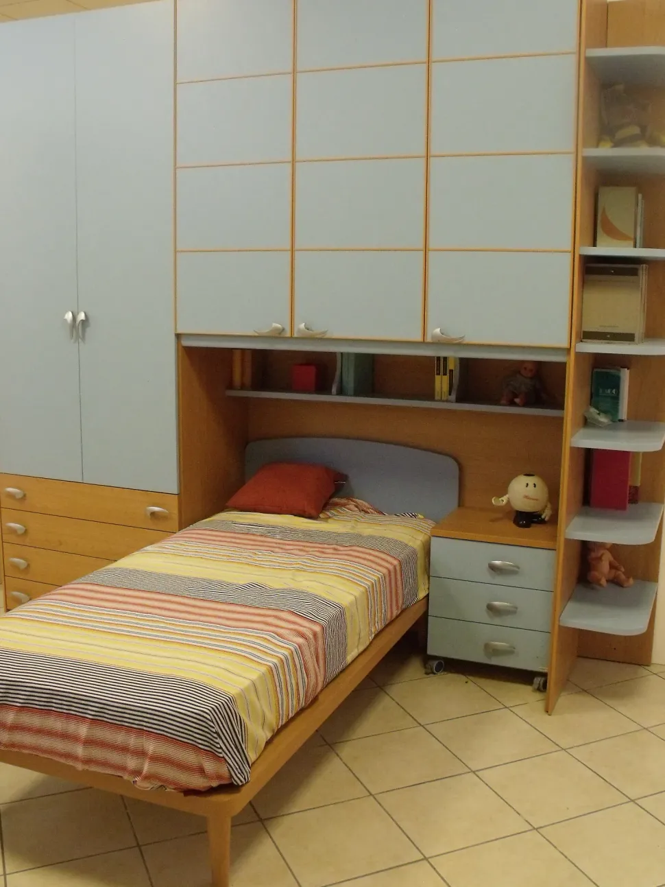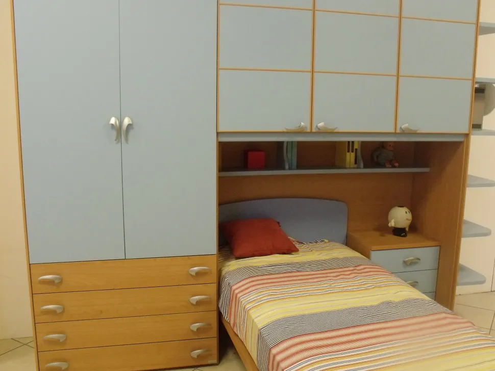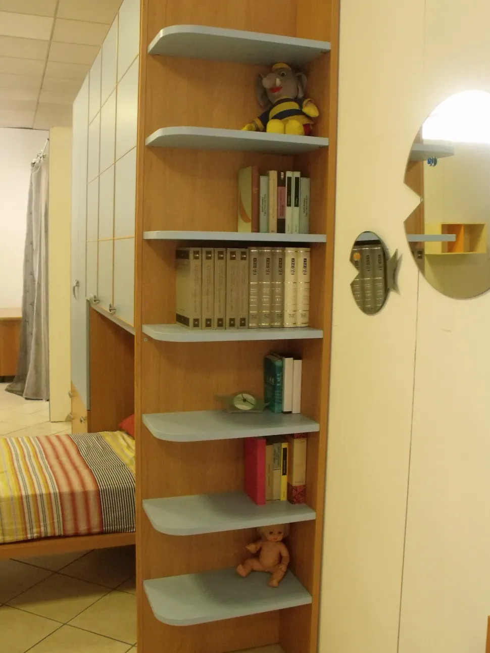 Struttura e cassetti in laminato ciliegio, ante e mensole laccate blu avio.
