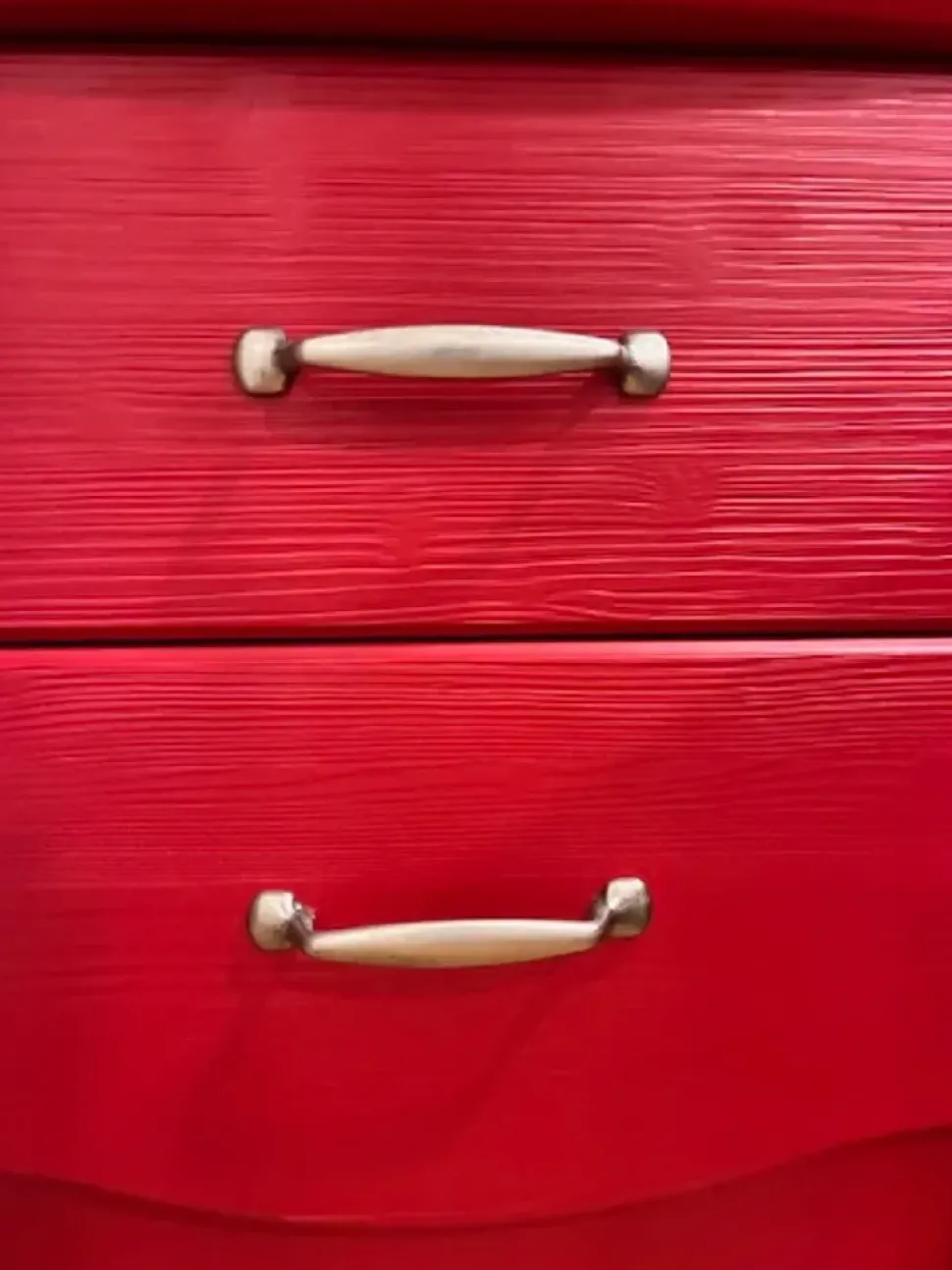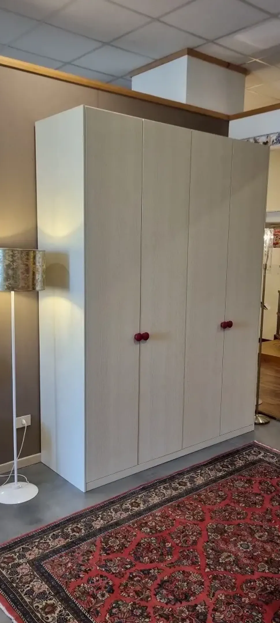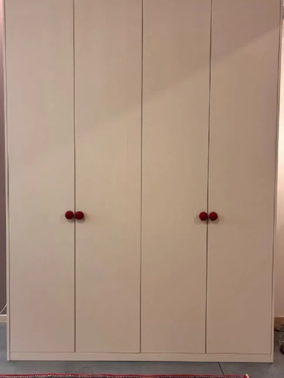 - armadio quattro ante battenti in legno massello, finitura burro coprente spazzolato, pomolo amarena – cassettiera interna due cassetti L 450 cm H 246 cm P 60