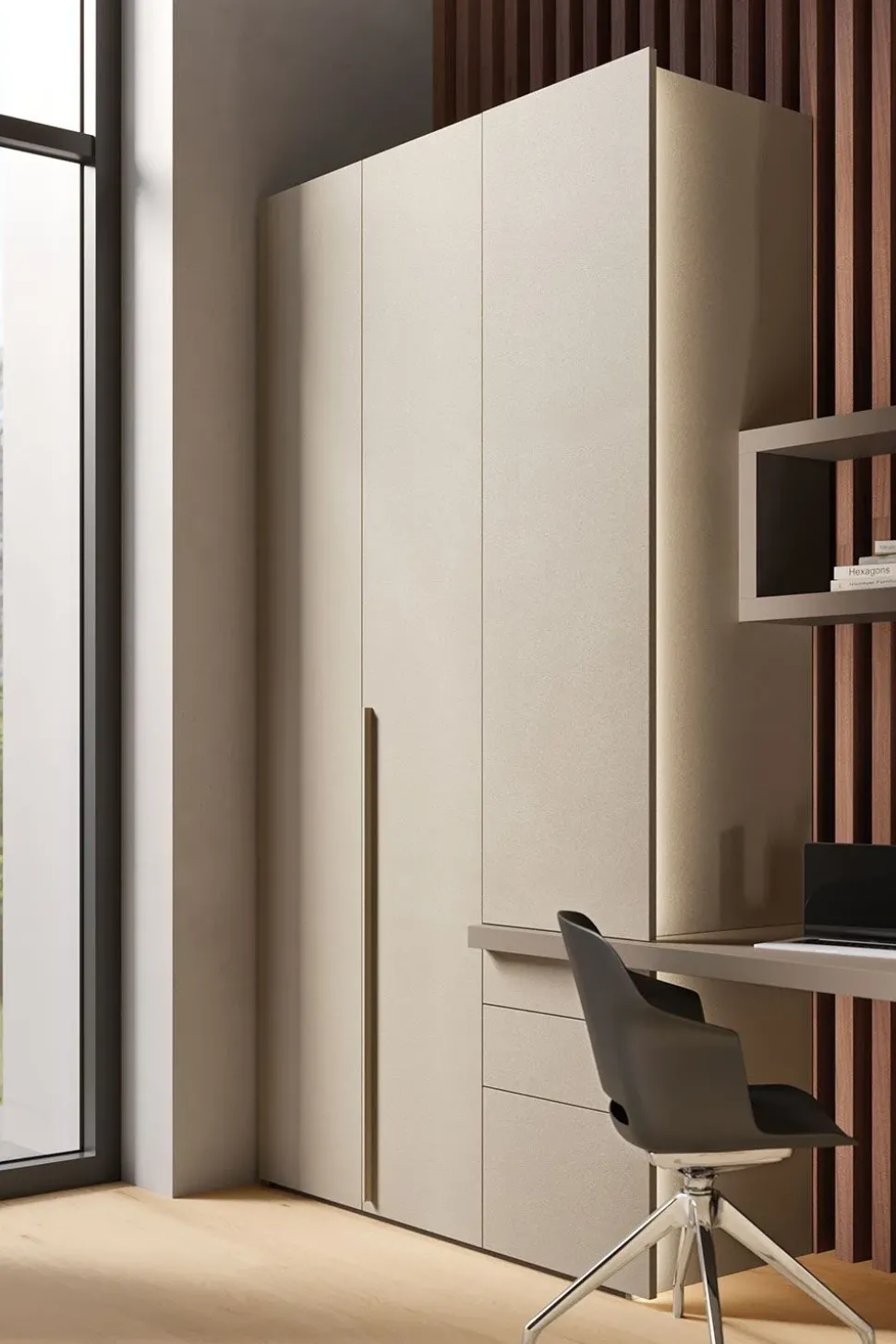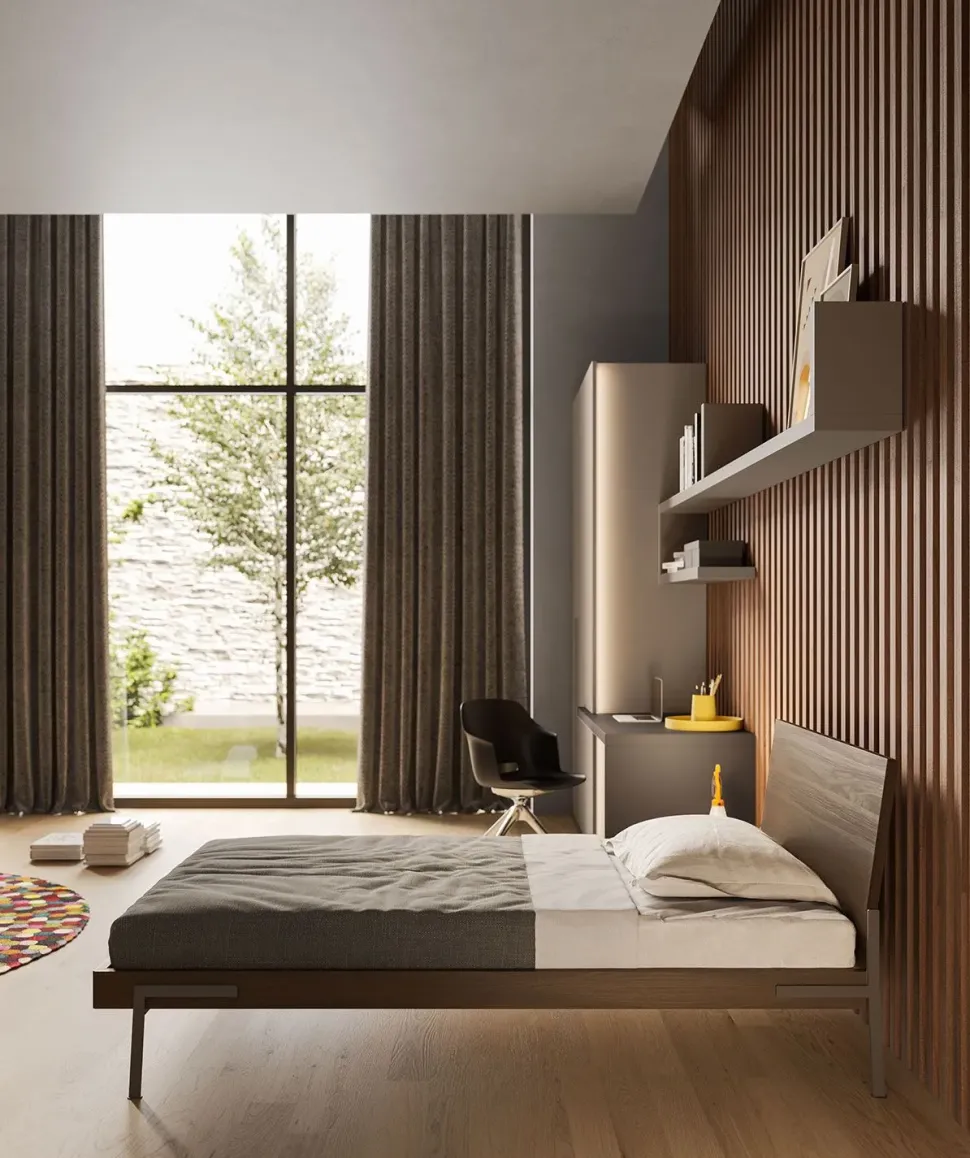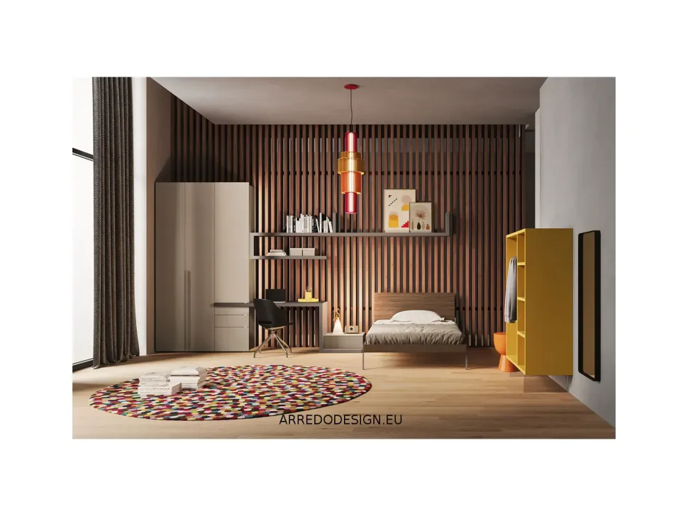 - Composta da armadio a 3 ante con scrittoio integrato, mensole Snake, comodino, letto Soter, elemento Kube a giorno.