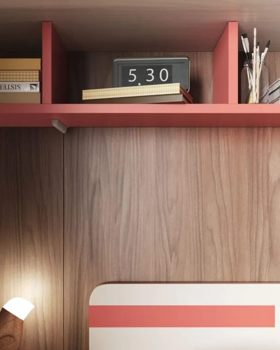 Il calore della finitura Noce definisce con eleganza lo spazio dedicato allo studio, mentre il comodino multifunzionale (non esplicitamente elencato ma sottinteso nella descrizione originale come elemento a duplice funzione) diventa un alleato quotidiano per libri, lampade o oggetti personali. L equilibrio tra forme, colori e funzionalità rende questa cameretta perfetta per crescere con stile e organizzazione.