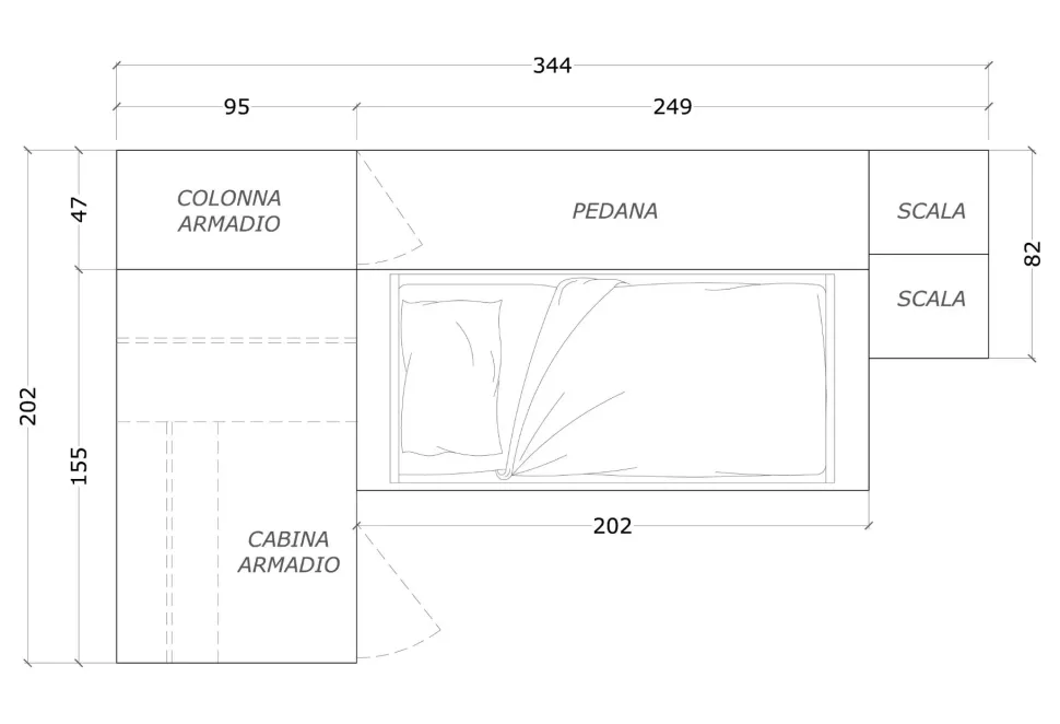 Completa la composizione una colonna armadio situata sopra il letto in corrispondenza della pedana.