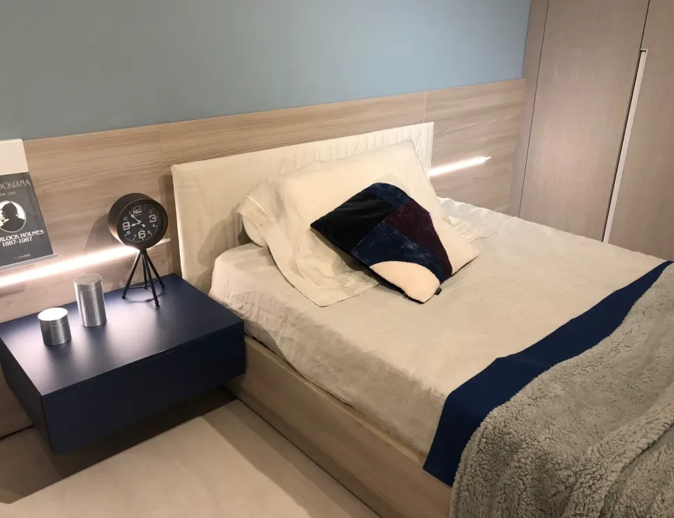 pannellatura: melaminico olmo sand, comodino melaminico blu, pensili melaminico pomice