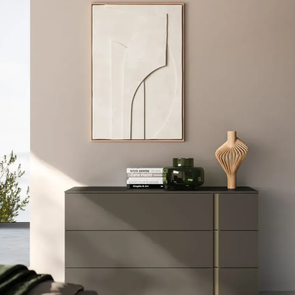 Gruppo Aries – dettaglio 02:Comodini e comò Aries in laccato opaco Titanio con particolare maniglia in laccato opaco Tufo.