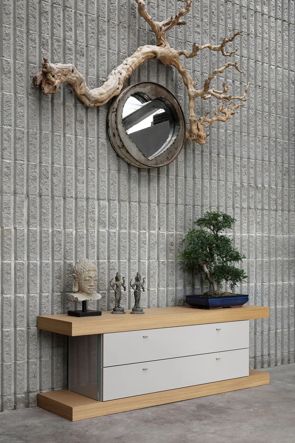 Credenza con piani orizzontali in tamburato di spessore mm 80, impiallacciati in Rovere Naturale, finitura opaca. Le linee verticali di spessore 8 mm, sono composte da cristalli extra chiari temperati. Completa il sistema una cassettiera a due cassetti, in laccato opaco goffrato, colore Grigio Forme’s, da cm. 120