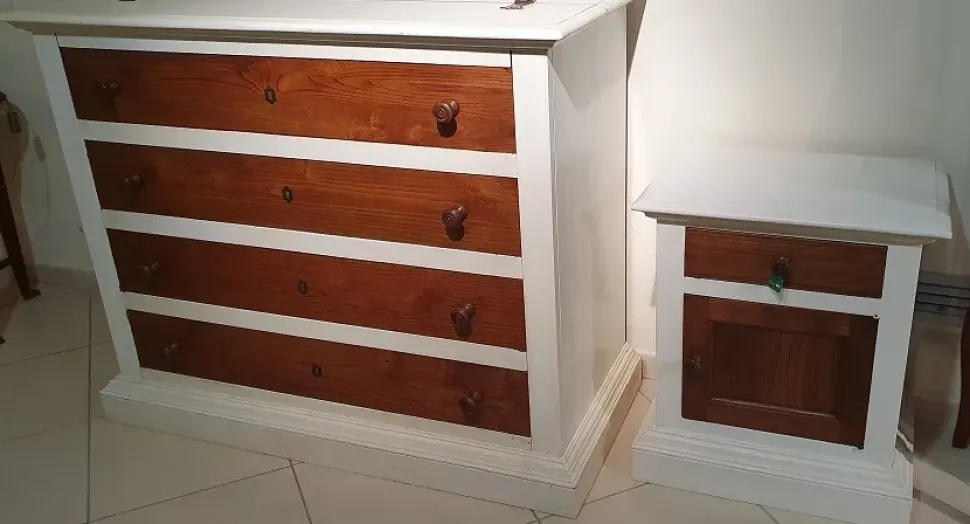 Gruppo comò e comodini di dimensioni generose, le dimensioni del cassettone sono L.131 x p. 57/72 x h. 105 cm mentre quelle dei comodini sono L. 60 x p. 40 x h. 70 cm. il gruppo è caratterizzato da una doppia finitura sia in noce che in un laccato avorio patinato a mano ed entrambi rifiniti a cera. Le dimensioni permettono un ottimo contenimento sia nel cassettone che nei comodini; il cassettone è caratterizzato da un’ampia ribalta nella parte superiore, ribalta caratterizzata da 4 cassetti e un’ansa centrale, i comodini hanno come particolarità la disponibilità di un vano chiuso ad anta ed esiste il comodino con anta destra e quello con anta sinistra, oltre allo sportello hanno anche un comodo cassetto.