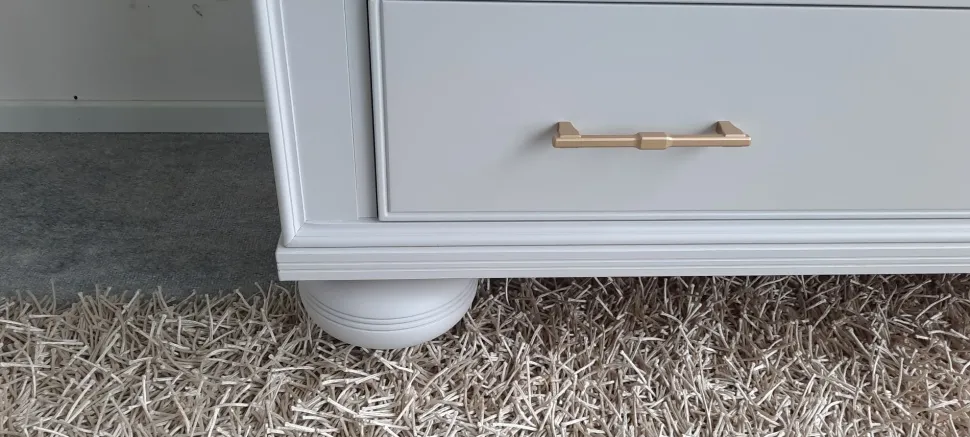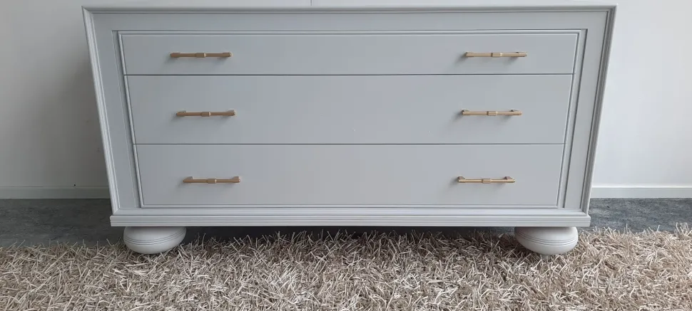 Comò a 3 cassetti completamente in legno , con finitura laccata color cenere opaco , impreziosito da maniglie color oro satinato , zoccolo a cipolla in legno massiccio Misure 134x56x74h POSSIBILITA’ DI AVERLO IN ALTRI COLORI (VEDI SCHEDA ALLEGATA) TRASPORTO IN TUTTA ITALIA INCLUSO NEL PREZZO (ISOLE CON SUPPLEMENTO)