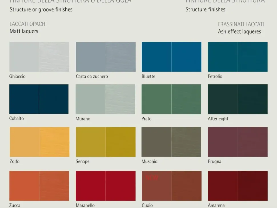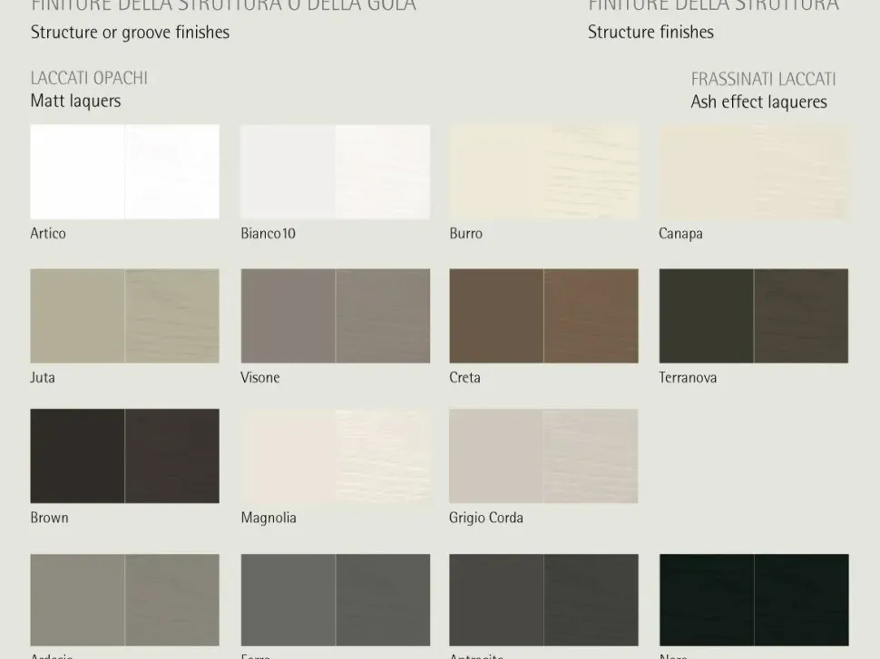 – Finiture: rovere tinto impiallacciato, frassino laccato oppure nobilitato laccato opaco nei colori da campionario.