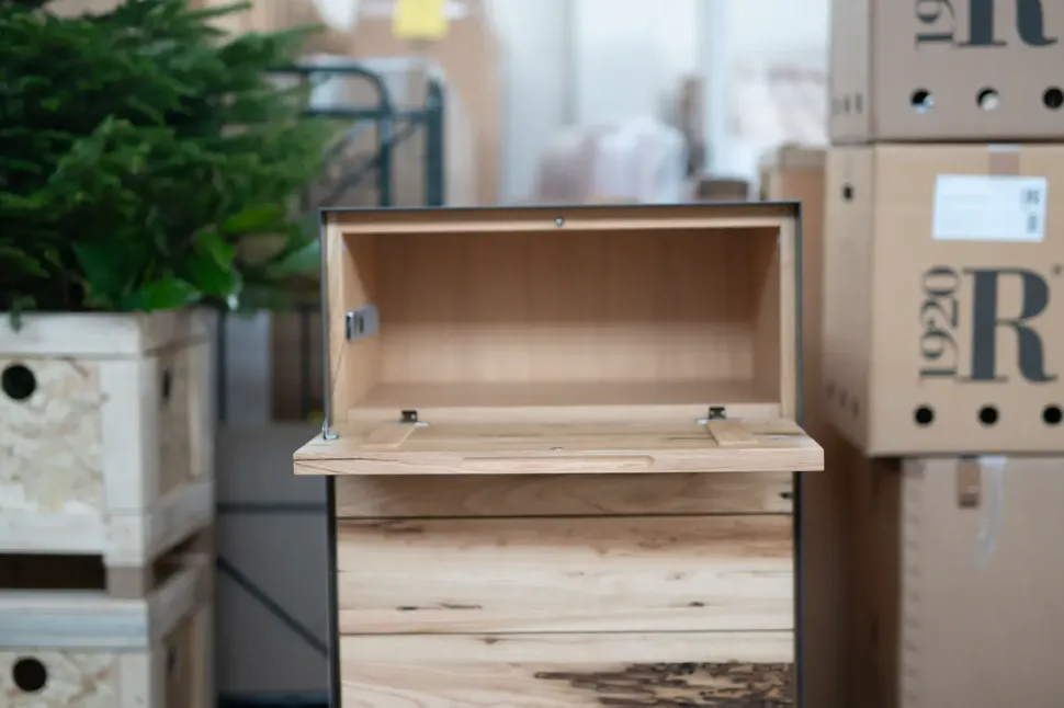 Cassettiera in fin.Briccola con parte metallica fin.Irondust e schienale fin.Rovere