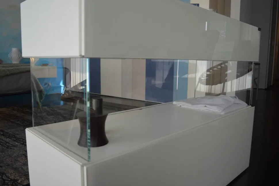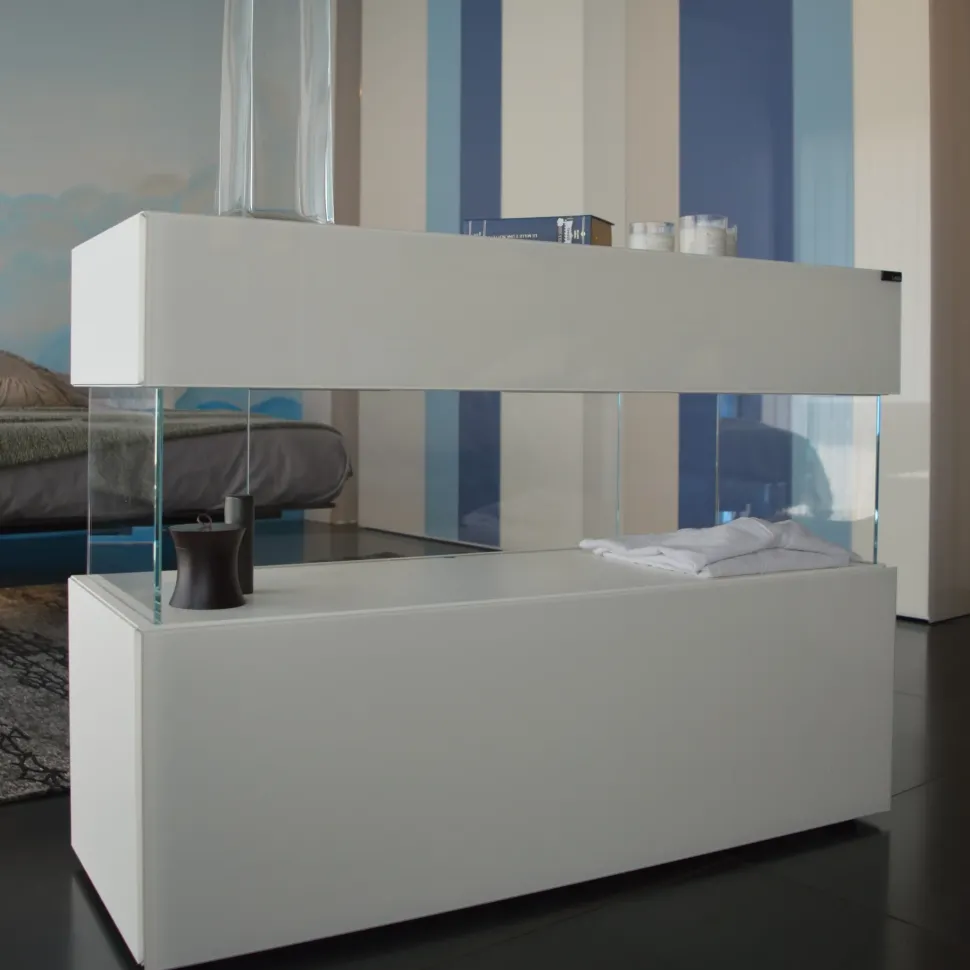 COMO’ LAGO MODELLO AIR Il comò di Lago modello Air è una cassettiera composta da un cassettone, un cassetto ed un vano a giorno. La composizione Air infatti, è un comò a terra formato da un cestone di dimensioni cm 110,4 di larghezza, cm 36,8 di altezza e cm 40,6 di profondità in legno laccato opaco bianco e frontale in vetro lucido bianco, un set alzata in vetro temperato trasparente alto cm 25 e un cassetto di dimensioni cm 110,4 di larghezza, cm 18,4 di altezza e cm 40,6 di profondità in legno laccato opaco bianco e frontale in vetro lucido. Le giunzioni dei contenitori sono in alluminio anodizzato a 45°. Il comò misura totalmente cm 110,4 di larghezza, cm 81 di altezza e cm 40,6 di profondità. La composizione Lago può essere utilizzata nella zona notte comò o nella zona giorno come mobile contenitivo o mobile da ingresso. Consigliato il fissaggio a parete. Siamo rivenditori Lago a Pontelongo vicino a Padova ed effettuiamo spedizioni in tutta Italia e all’estero. Siamo a disposizione per qualsiasi altra informazione.
