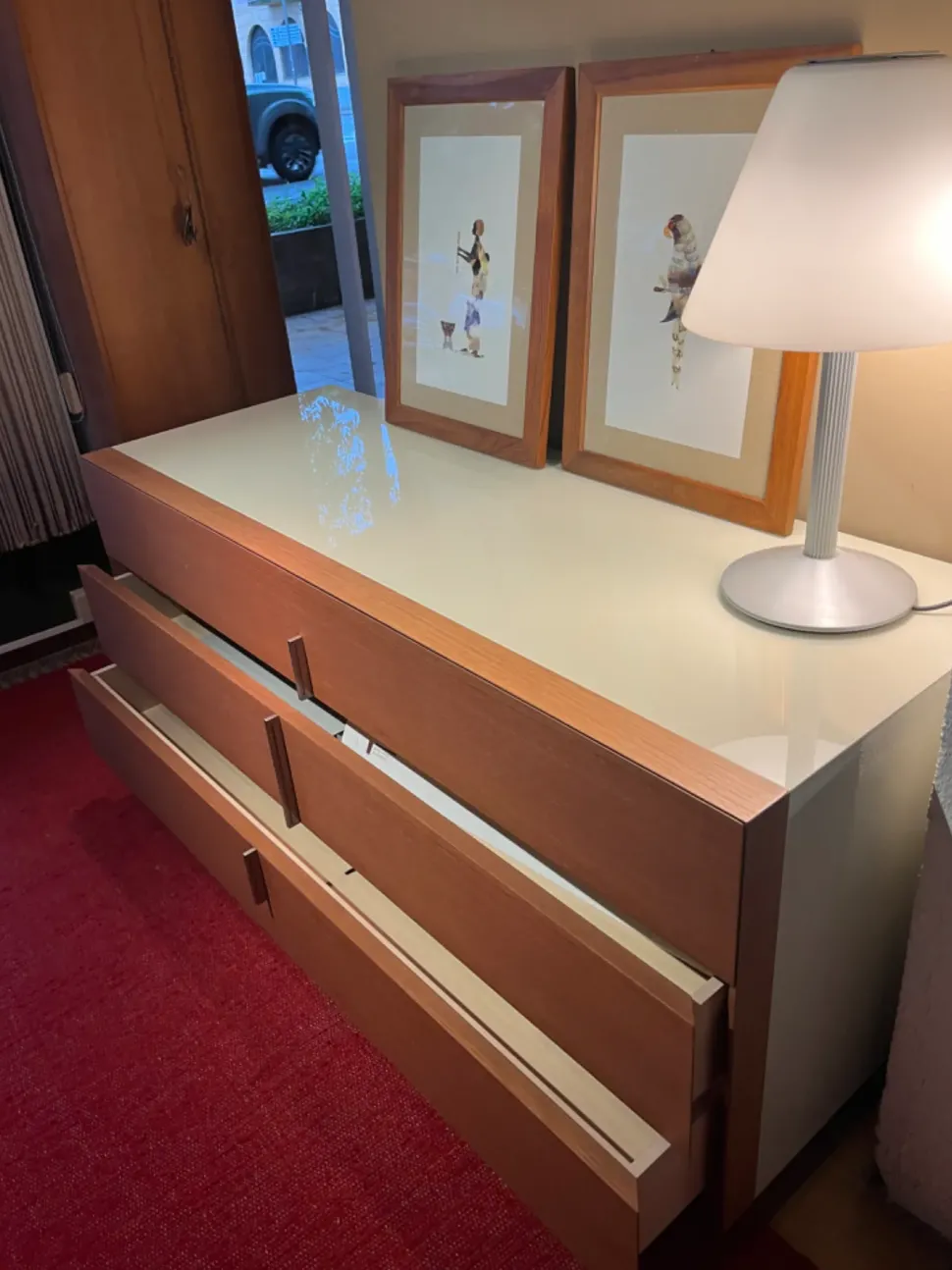 Cassettone a tre cassetti in teak con top in vetro retro laccato color nuvola . Finitura cassetti a 45 gradi . Misura cm 150 x 55 x 70 di altezza ,