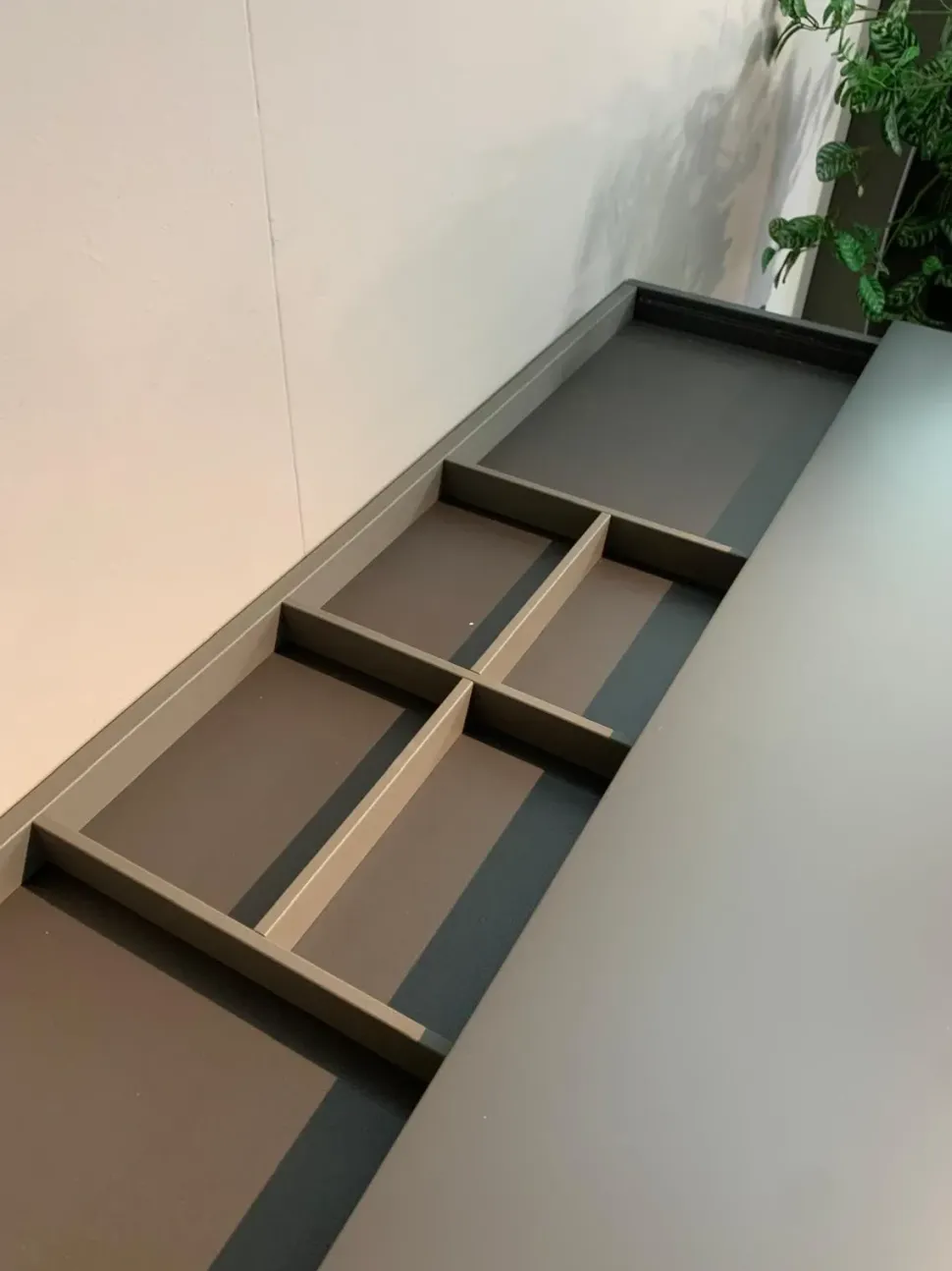 Cassettiera in laccato opaco con maniglia fresata, top scorrevole con portagioie all’interno.