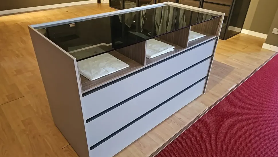 Comò Adok mod. Stream, dotato di 3 cassetti con 3 vani a giorno, top in vetro trasparente fumè, struttura materico titanio, elemento a giorno finitura caramel, maniglia dei cassetti in metallo.