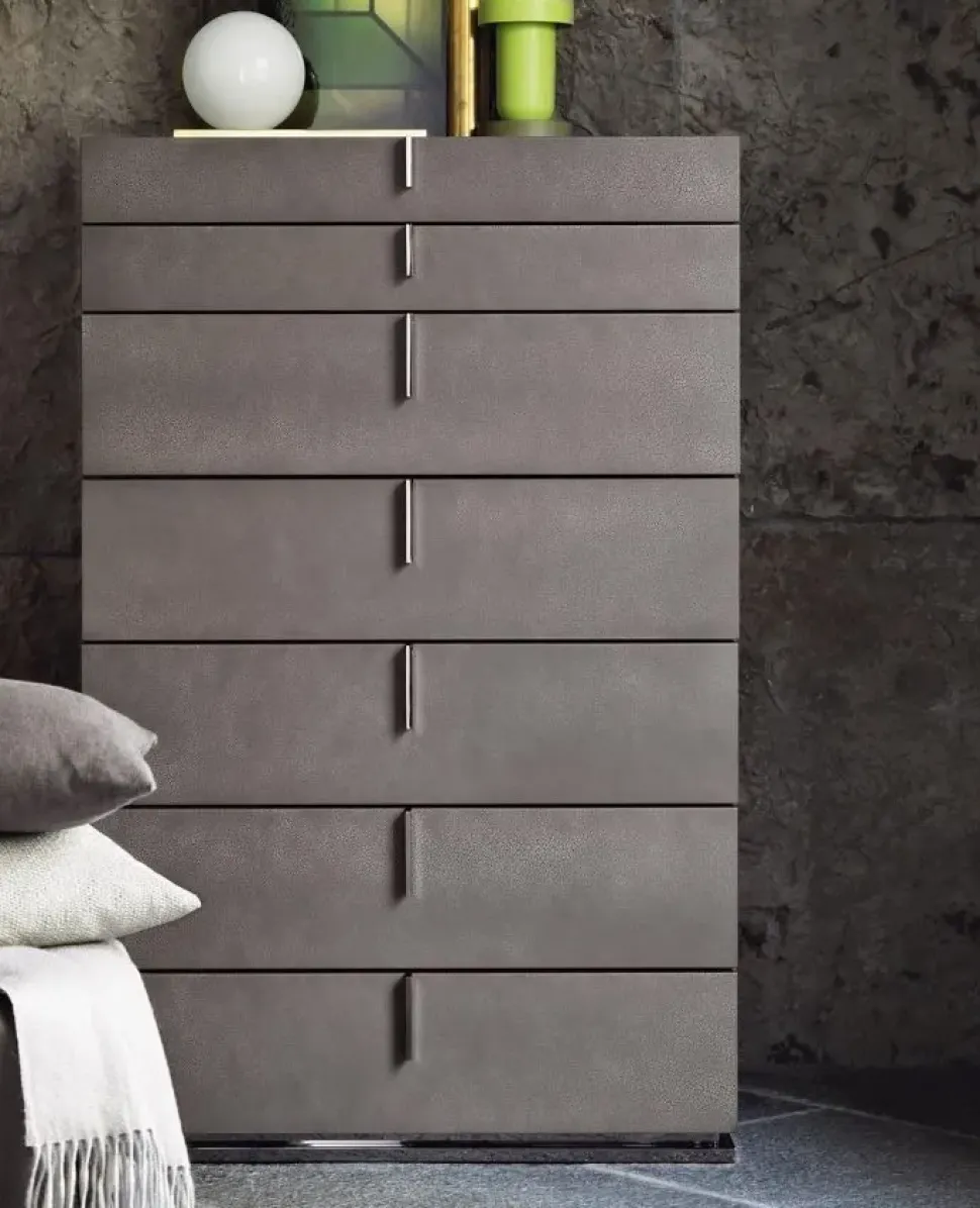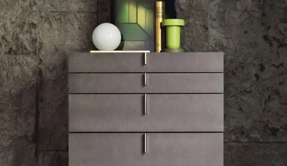 Comodini e settimanale con struttura in legno impreziosita dalla laccatura effetto galuchat opaca disponibile in due colori: Laguna e Deserto. I cassetti sono dotati di ritorno, l’interno è tinto nero mentre le maniglie e la base sono in nickel nero lucido.