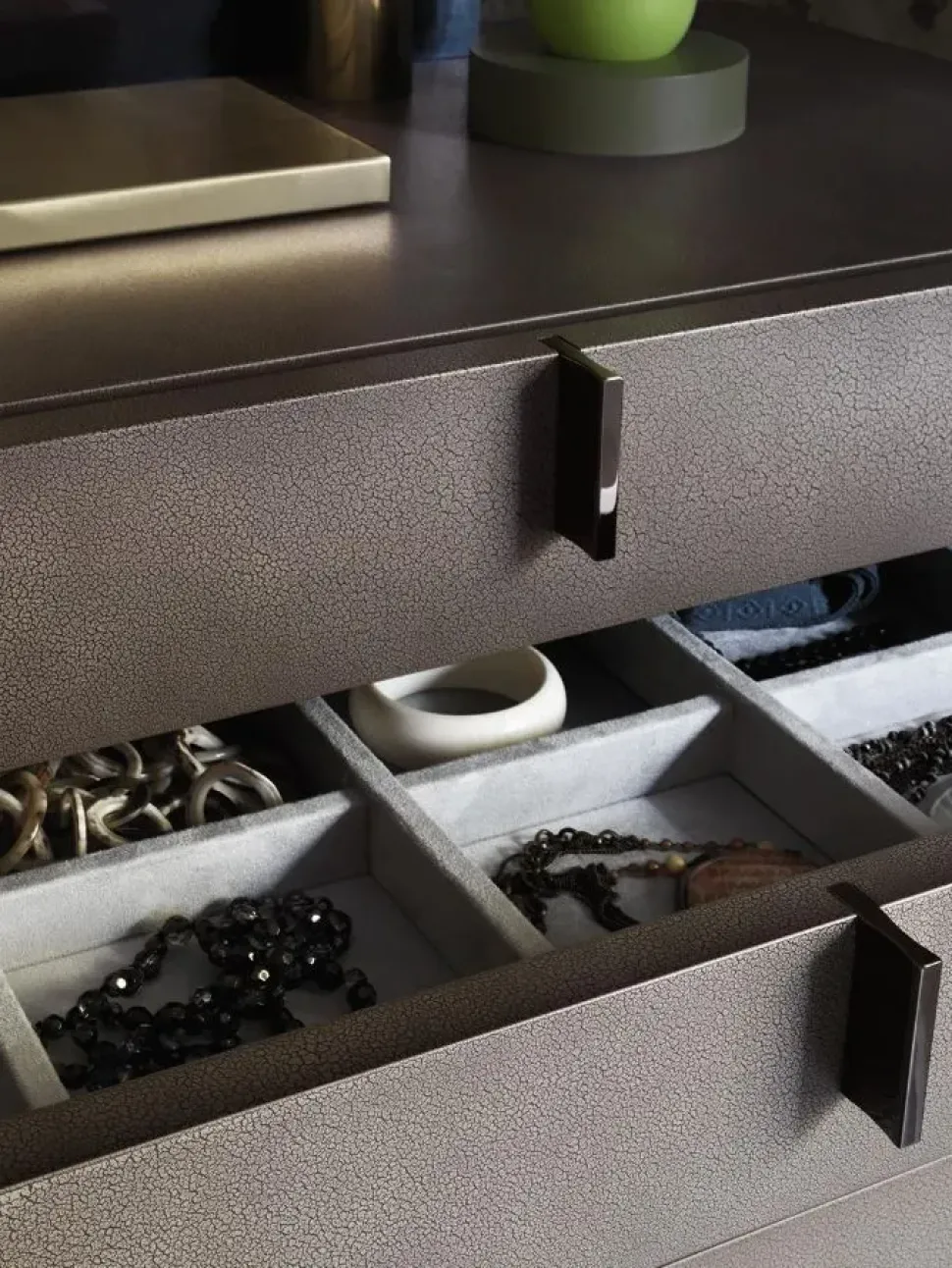 7 cassetti tra cui il primo ed il secondo cassetto si completano con divisori interni portagioie rivestiti in tessuto