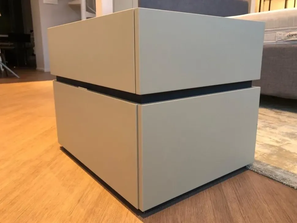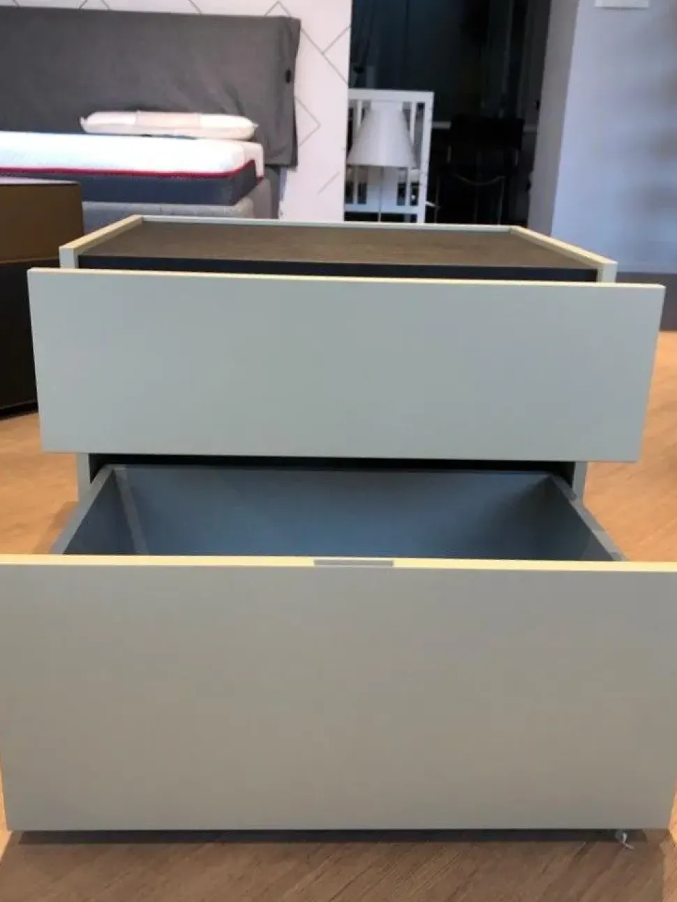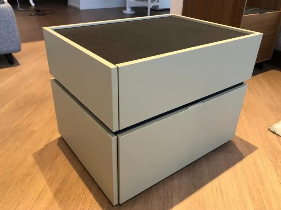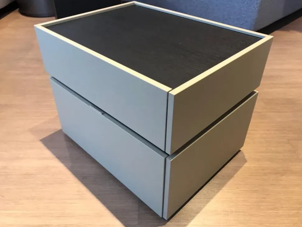 È caratterizzato dal perimetro esterno (composto da frontale, schienale e fianchi) rialzato rispetto al piano superiore creando un effetto a vassoio. Il contenitore è rifinito in tutto il perimetro ed è composto da due cassetti ad estrazione totale con chiusura rallentata. Il contenitore ha un altezza totale di 46cm: il primo cassetto è di 16,5cm di altezza (19cm compreso di gola) e il secondo cassetto è 24,5cm (27cm compreso di zoccolo).