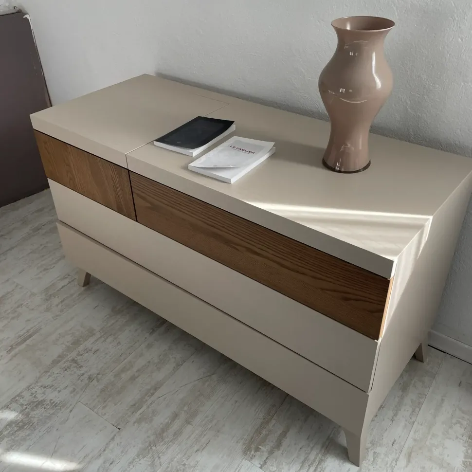 Gruppo Letto Le Fablier linea Le Spezie comprensivo di Comò modello Zafferano e nr. 02 Comodini modello Citronella, nelle finiture Laccato Avorio ed Essenza Zenzero.