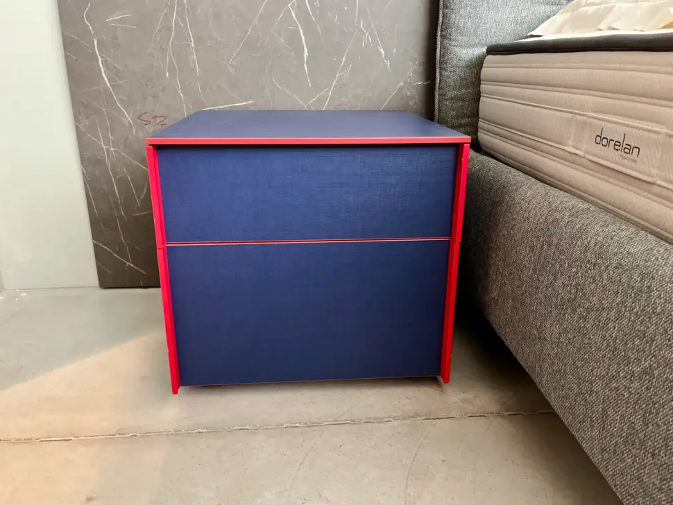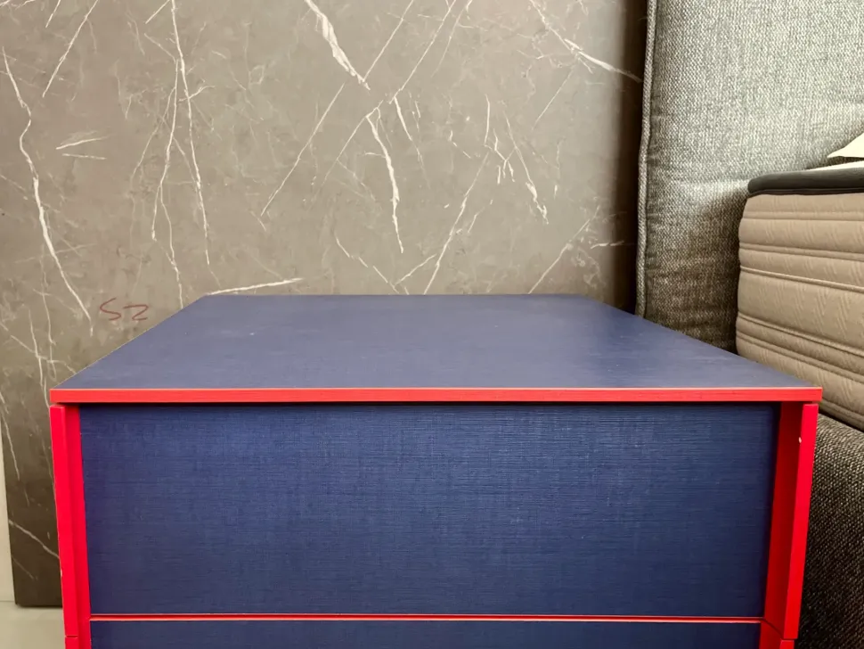 Il design essenziale, arricchito dal gioco cromatico tra blu e rosso, rende questo comodino un pezzo versatile: perfetto in abbinamento a letti e armadi moderni, ma anche come elemento di contrasto in ambienti più classici.
