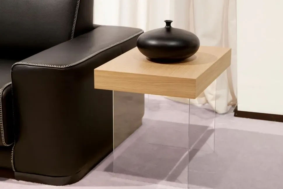 Tavolino con piano orizzontale in tamburato di spessore mm 80, impiallacciato in Rovere Naturale, finitura opaca. Le linee verticali di spessore 8 mm, sono composte da cristalli extra chiari temperati. In omaggio, in dotazione 4 piedini regolabili in metallo, finitura ottone e 2 paraspigoli per bambini (vedere gallery fotografica).