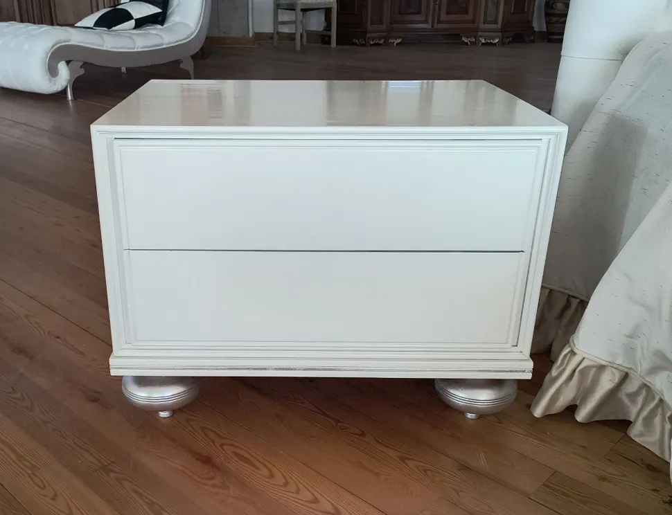 Comodino in legno laccato bianco con piedini a cipolla finiti in foglia argento , prodotto artigianale , finito interamente a mano , misure 65x48x50h , guide cassetti in legno con impugnature laterali , no PUSH-PULL, TRASPORTO INCLUSO NEL PREZZO N° 2 PEZZI DISPONIBILI
