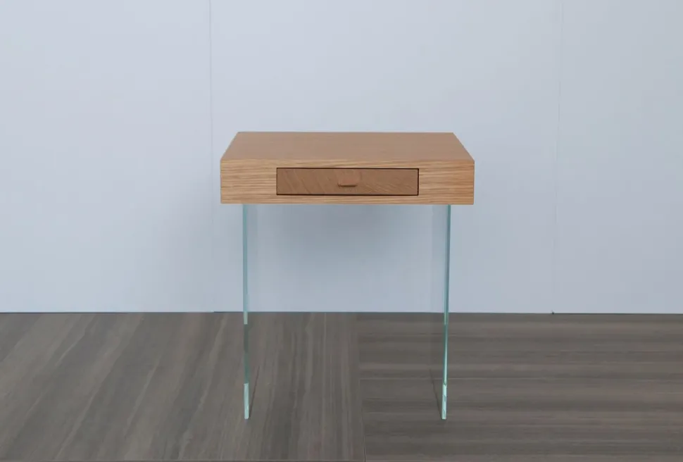 Tavolino con piano orizzontale in tamburato di spessore mm 80, impiallacciato in Rovere Naturale, finitura opaca. Dotato di un cassettino svuota tasche, interno antigraffio. Le linee verticali di spessore 08 mm, sono composte da cristalli extrachiari temperati. In omaggio, in dotazione 4 piedini regolabili in metallo, finitura ottone e 2 paraspigoli per bambini (vedere gallery fotografica).