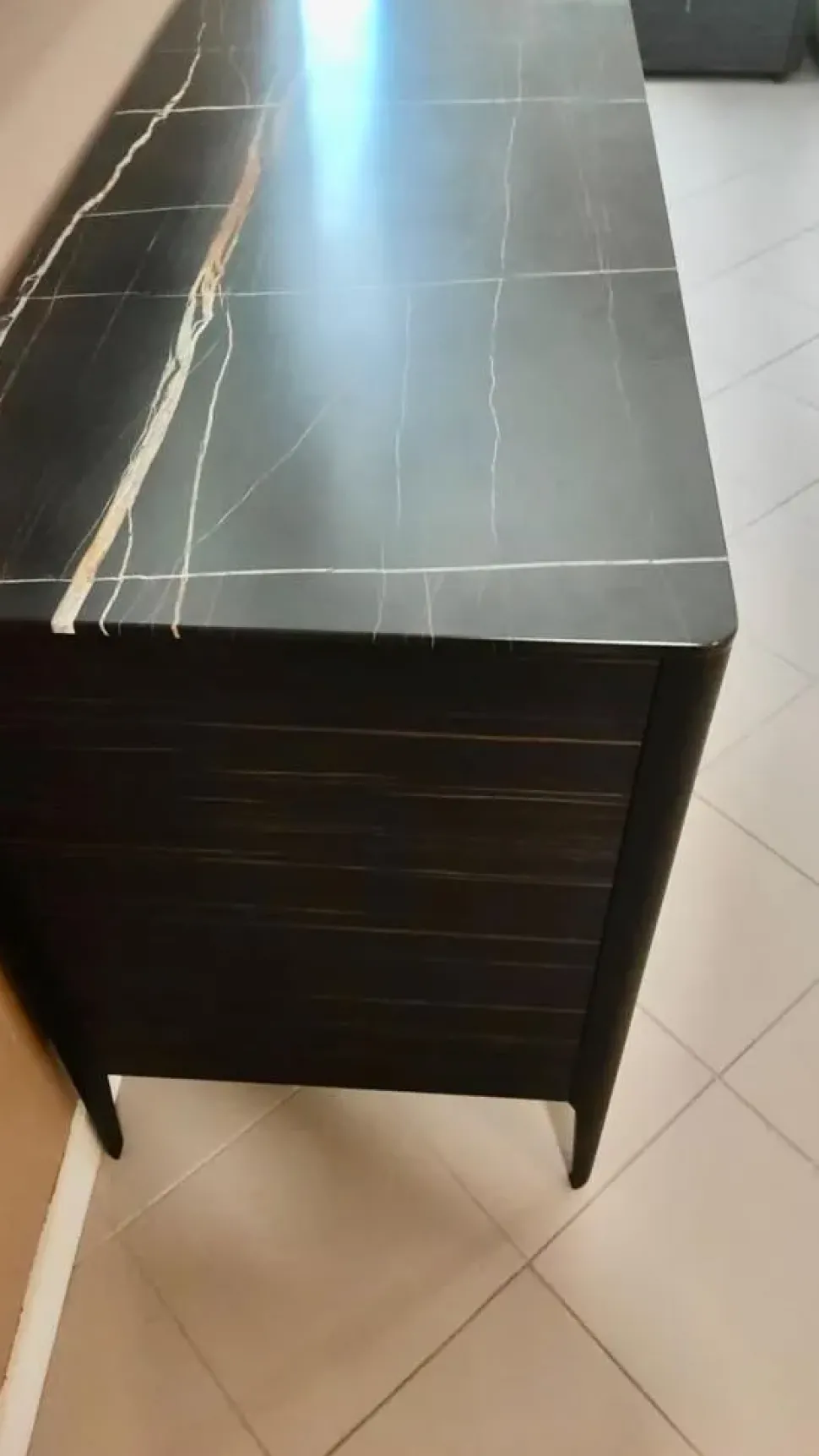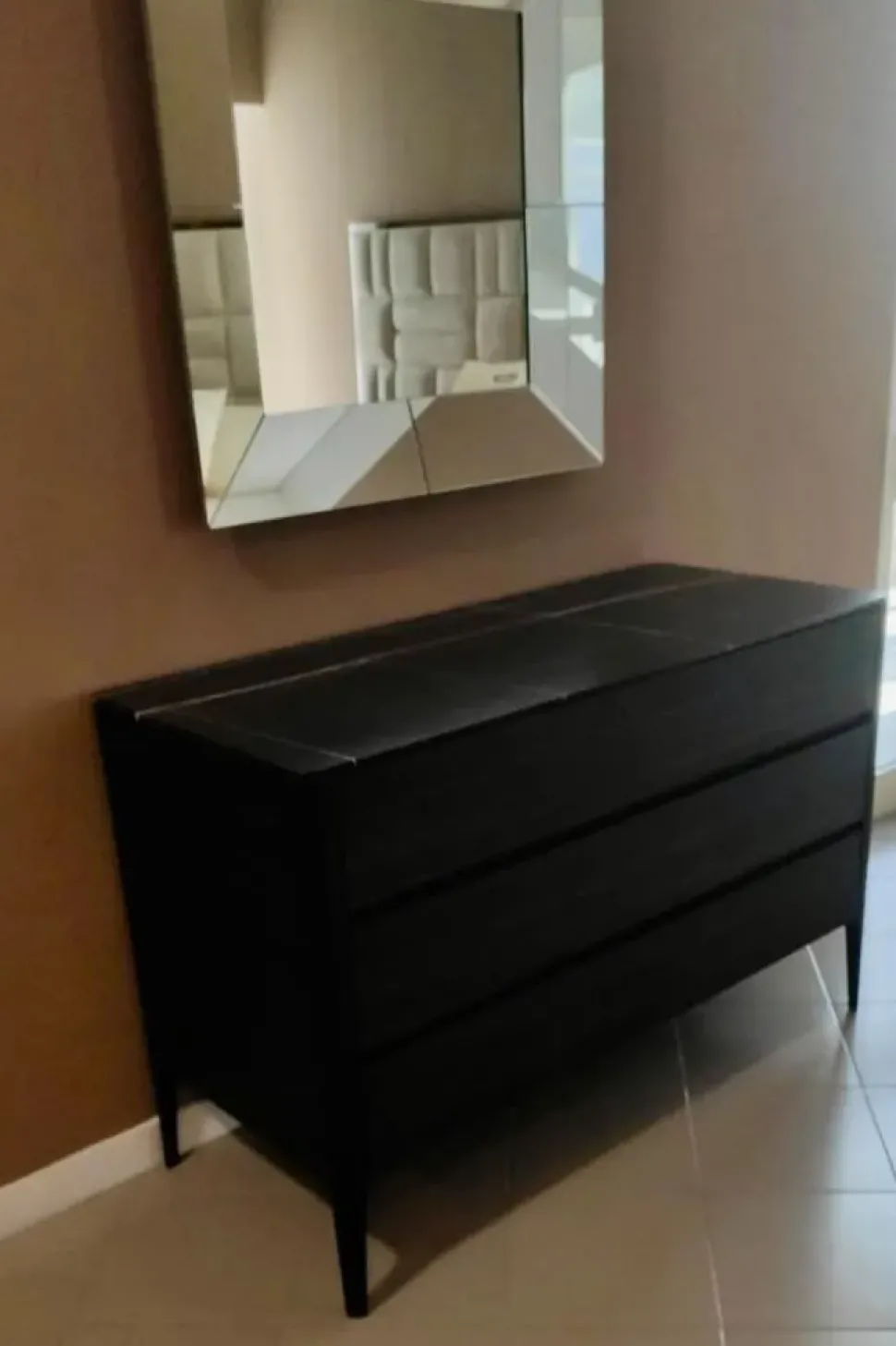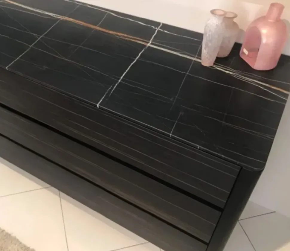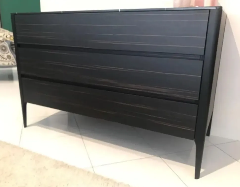 – 01 comò mod. Marie con gola e piede. Finitura struttura ebano scuro, piano in marmo sahara nero. Dimensioni: L 125 P 54 H 81