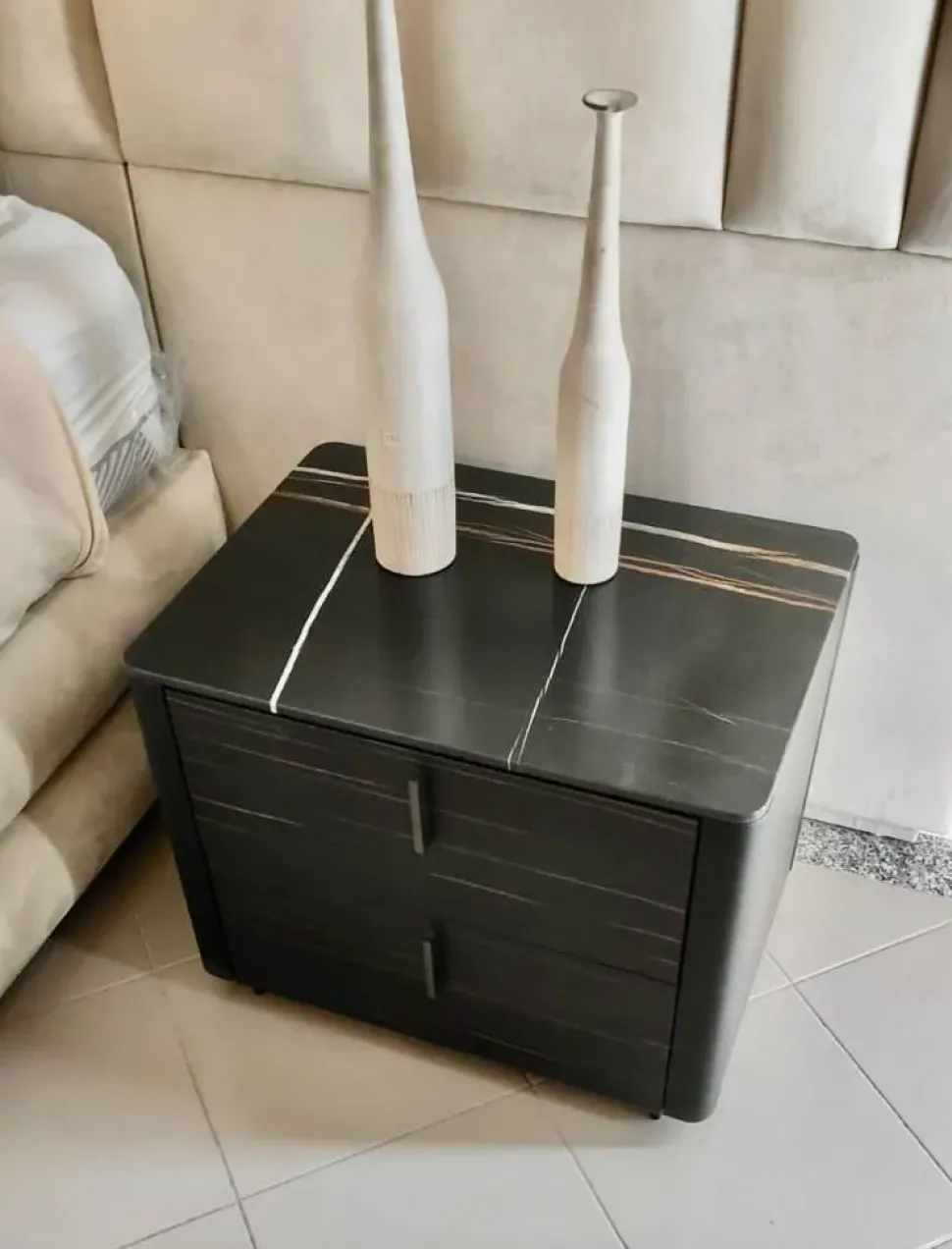 – 01 comodino mod. Nuage con maniglia verticale fin. ottone brunito. Finitura struttura ebano scuro, piano in marmo sahara nero. Dimensioni: L 55 P 40 H 43