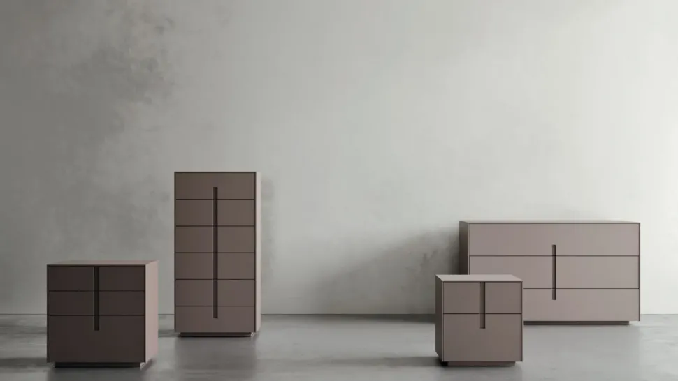 L’apertura a gola è il tratto distintivo del gruppo Ilo, composto da due tipologie di comodini, un comò e un settimanale.