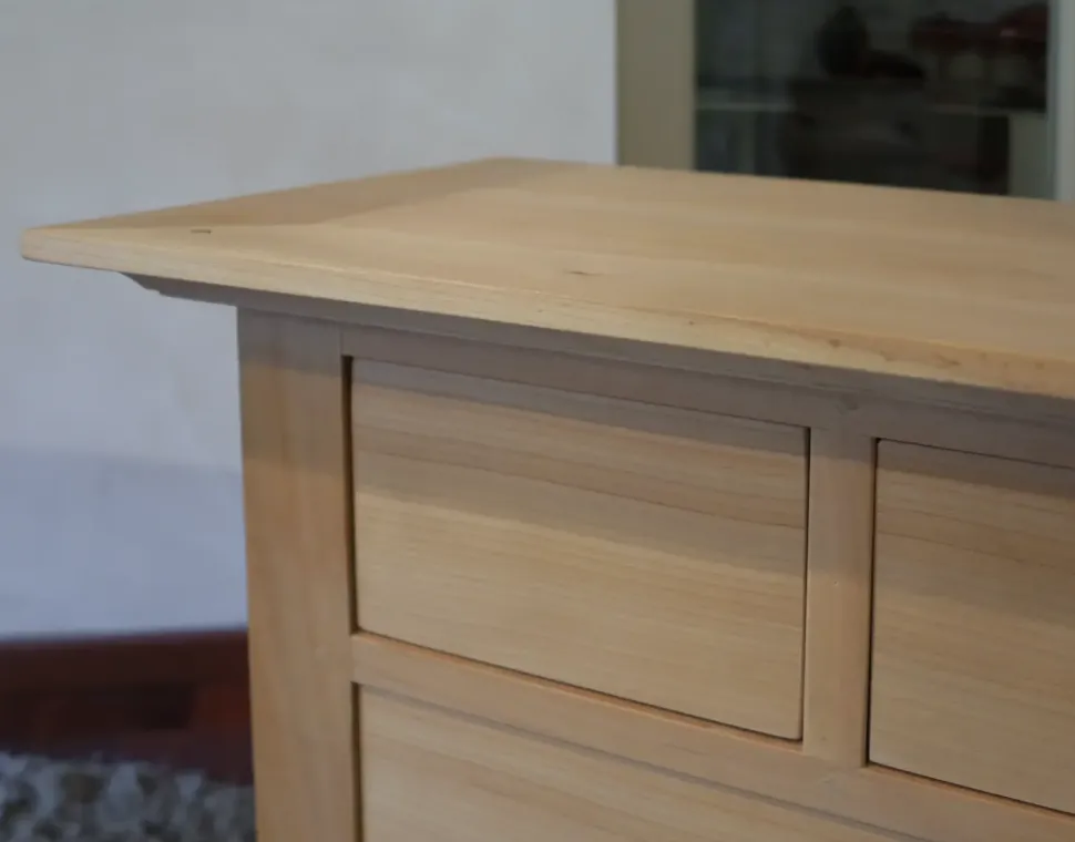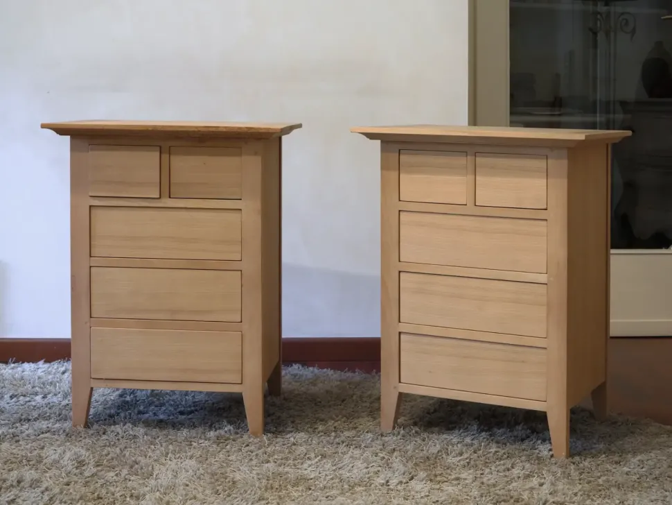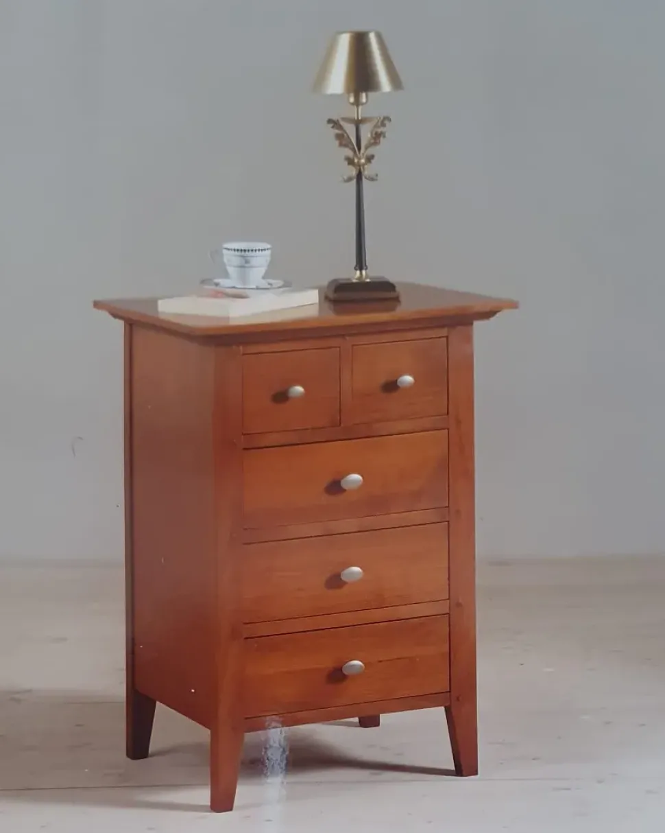 Comodini di stile eclettico realizzato in ciliegio europeo, lineare e dotato di 5 cassetti con pomoli.