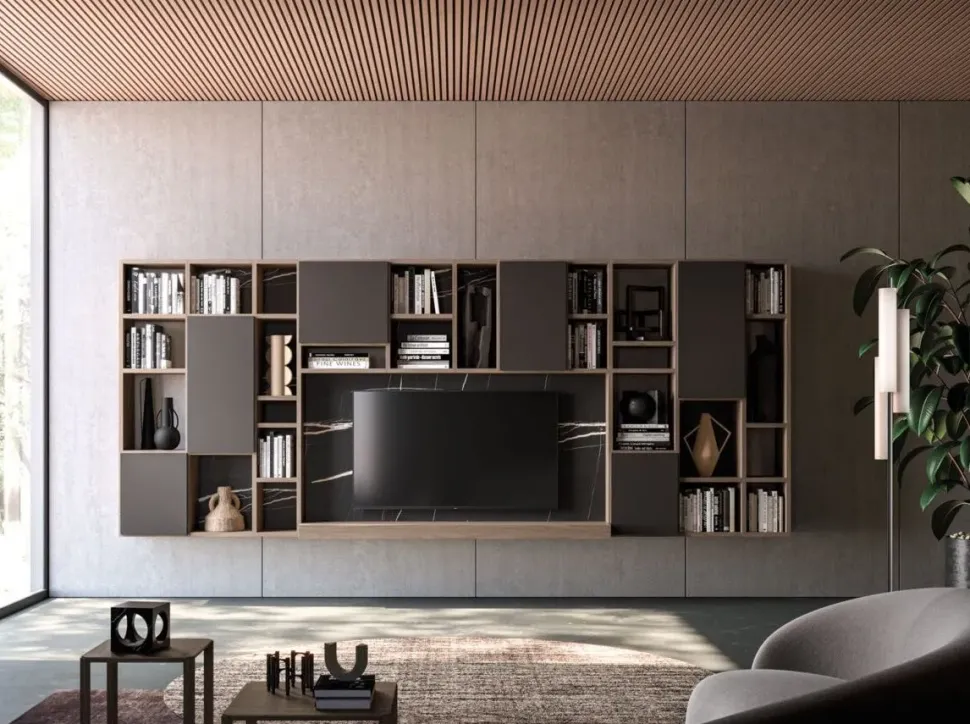 Dai forma al tuo living con una spazioso composizione completa di tutto, in grado di assicurarti tutta la praticità di un mobile sospeso.