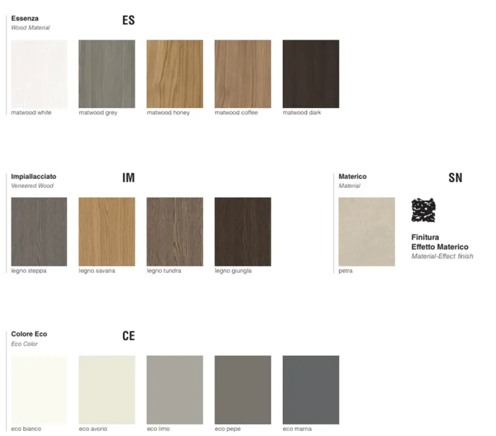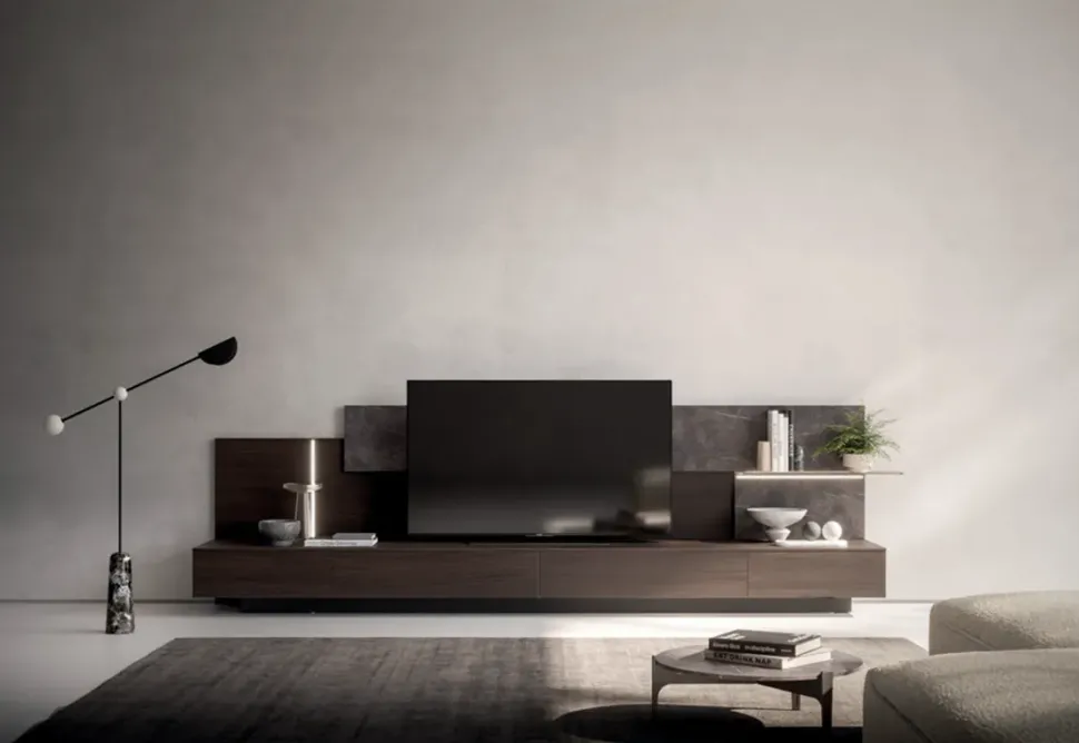 Il soggiorno nella fotografia si compone di diversi mobili e oggetti accessori, impreziositi dalla finitura in laminato materico per essere sempre sempre resistenti e di grande personalità.