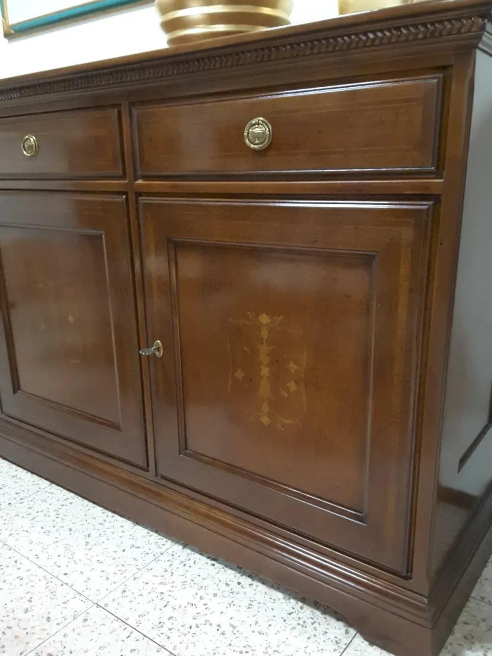 Ante del mobile con intarsio e decoro intagliato sul piano superiore.