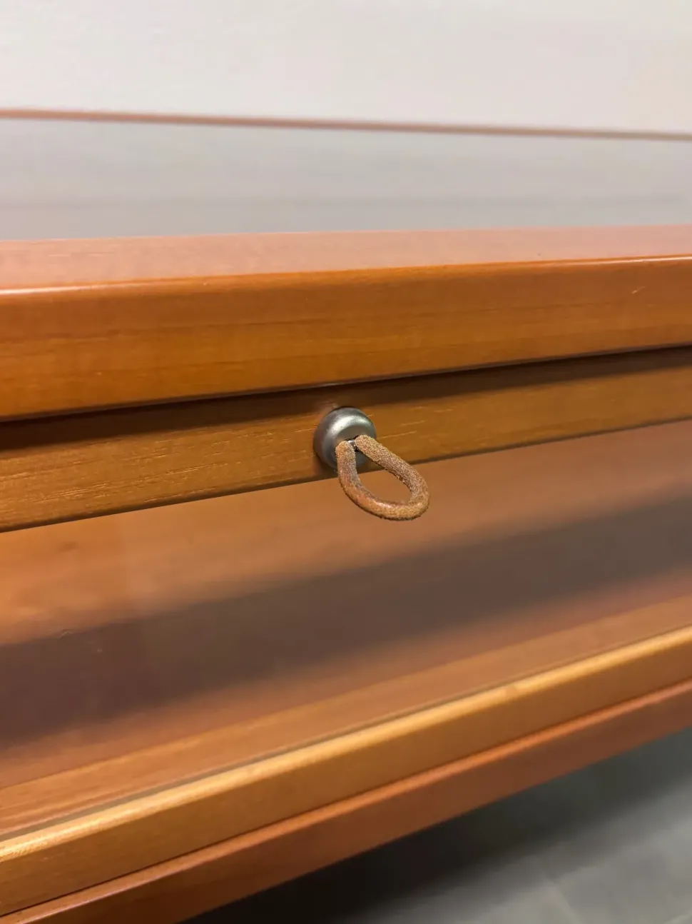 La consolle ha il top in vetro trasparente e tre antine a ribalta anteriori con pomolo in cuoio.