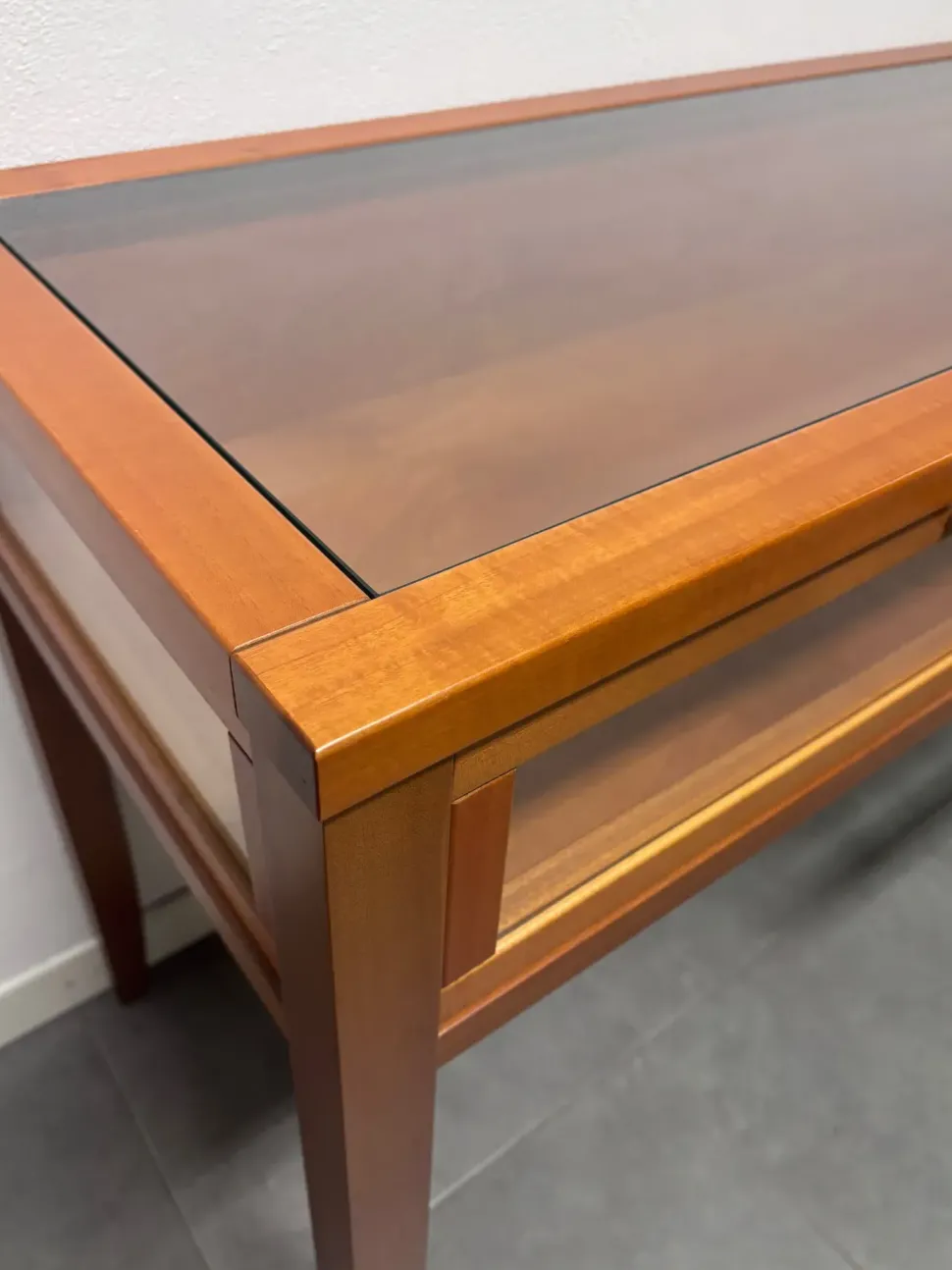 Consolle classica con funzione da espositore realizzata in legno massello tinto noce chiaro.