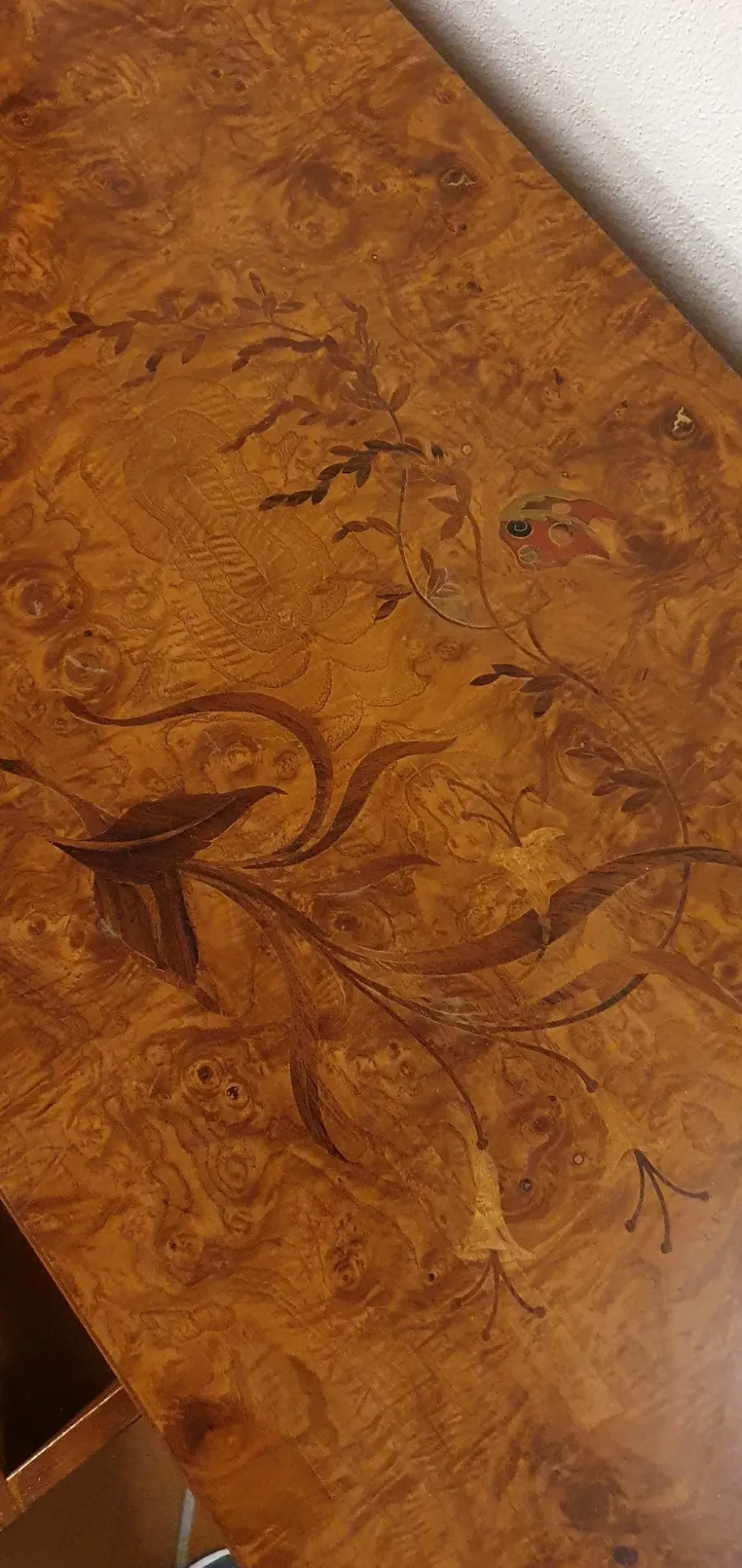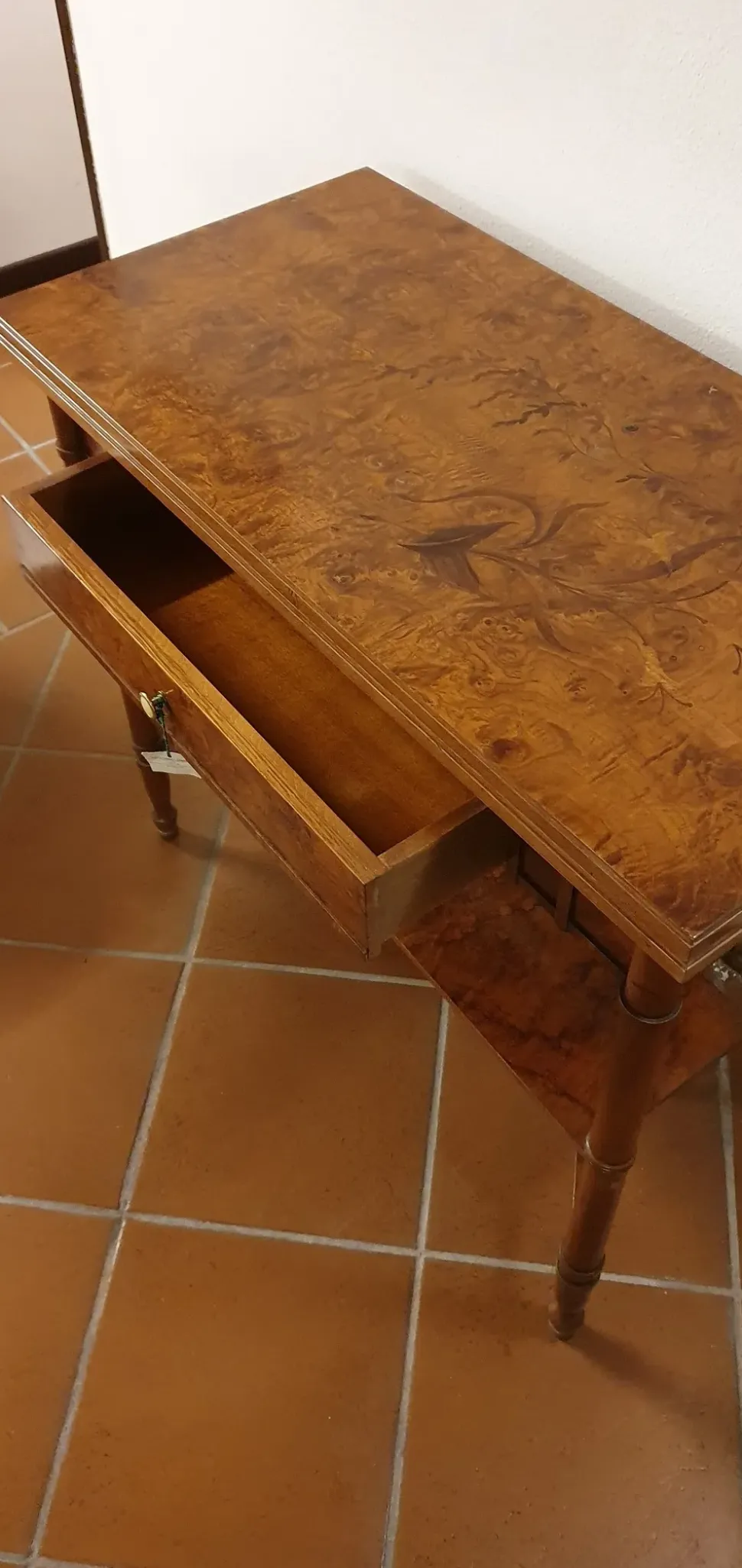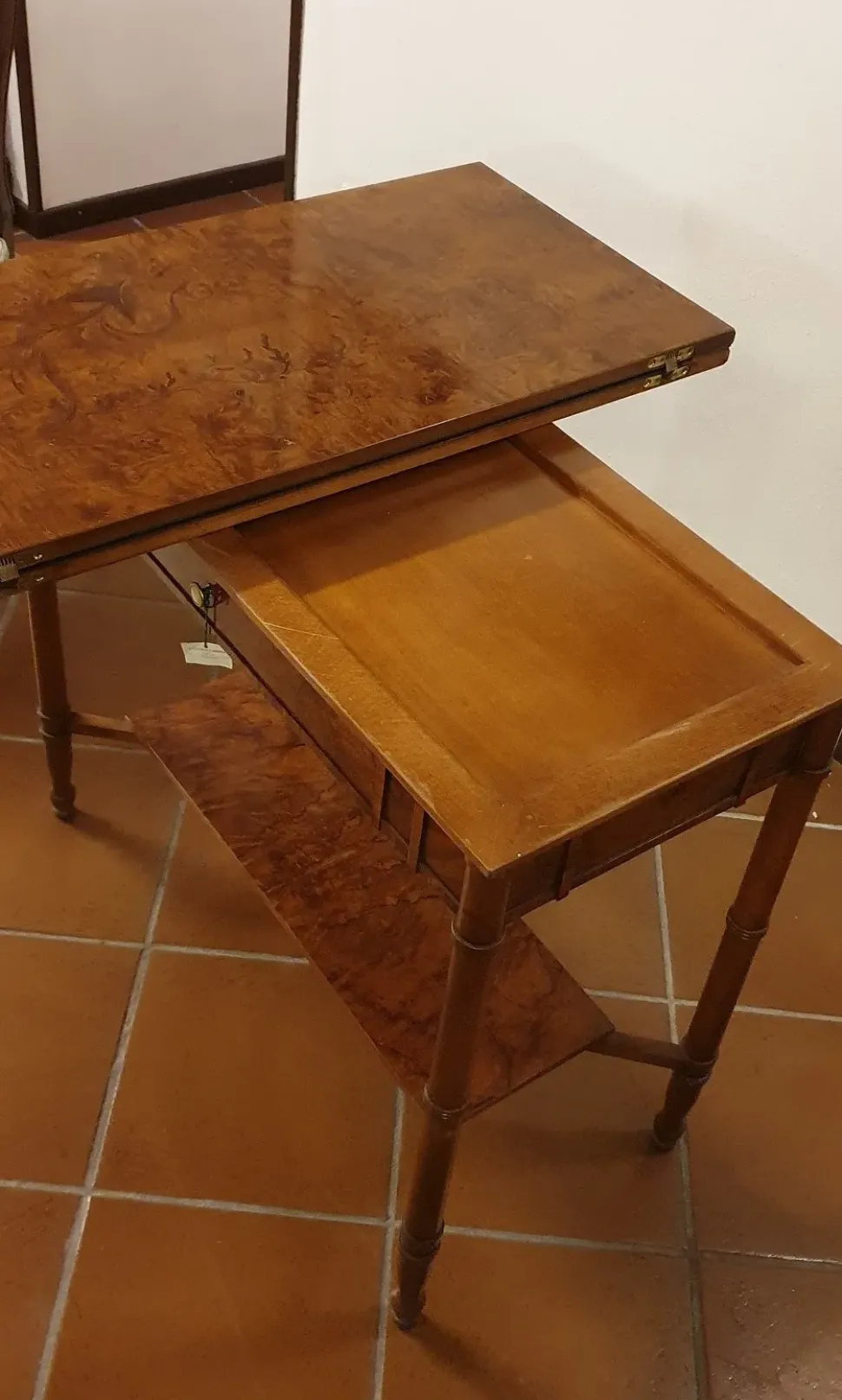 Consolle/tavolo da gioco realizzata con metodo artigianale in stile Art Decò, tutta in radica di frassino con preziosi intarsi sul piano a motivi floreali di dimensioni L. 90 x p. 45 x h. 80 cm. Non è solo una consolle ma con un semplice movimento si trasforma in tavolo da gioco da 90 x 90 cm con piano rivestito in pelle e cordonatura in oro. La consolle è completa anche di cassetto con pomello in ottone e madreperla. L’Eccellenza dei prodotti artigianali italiani è la qualità. Essa accompagna da sempre i suoi progettisti ed artigiani che vivono con passione ogni momento delle loro creazioni ponendo particolare cura al dettaglio, agli effetti più ricercati, al gioco delle proporzioni e a quello degli effetti cromatici. Una qualità che scaturisce dalla artigianalità, sinonimo di variazione, che garantisce l’assenza di ogni serialità proprio perché create a mano. Come per tutti i nostri mobili, l’imballo è omaggio ed il trasporto escluso, se richiesto, ci appoggiamo e lo preventiviamo solo con corrieri a noi abituali e specializzati in trasporto mobili.