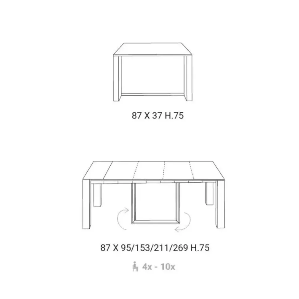 Consolle allungabile mod. MICRO con quattro allunghe incorporate nella struttura, realizzata in nobilitato e disponibile in varie finiture legno e cementi spatolati. Sistema di allunga telescopico in metallo e gamba centrale in metallo per supporto a meccanismo aperto (sempre in finitura grafite), la consolle Micro è dotata di rotelle per una più facile movimentazione e estensione. Le Dimensioni della consolle MICRO da chiusa sono larghezza 87 cm – profondità 37 cm – altezza 75 cm, si può estendere fino a 269 cm grazie alle quattro allunghe da 58 cm ciascuna. E’ POSSIBILE VISIONARE LA CONSOLLE MICRO PRESSO IL NOSTRO SHOWROOM DI LIMBIATE (MB).lA NOSTRA OFFERTA SULLA CONSOLLE MOD. MICRO SI RIFERISCE AL RIORDINO DA NUOVO CON POSSIBILITA’ DI SCELTA DELLE FINITURE. Il prezzo si intende Iva compresa e costo di trasporto / spedizione da calcolare in base alla destinazione (spedizioni possibili in tutta Italia). ARREDAMENTI ARNABOLDI SNC – 347 5426154