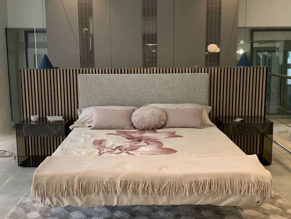 Letto matrimoniale Fluttua di Lago in pronta consegna. Fluttua è il primo letto sospeso al mondo che sfida la forza di gravità, dando forma all’emozione di dormire galleggiando nell’aria e regalando la sensazione di dormire leggeri. Un unico sostegno centrale, regolabile in altezza, sostiene il telaio, attaccato a parete tramite un fissaggio studiato: l’innovativo pianale in HPL risulta impercettibile alla vista, creando un magico effetto di sospensione e leggerezza del letto, soprattutto, grazie ad un sistema di illuminazione.