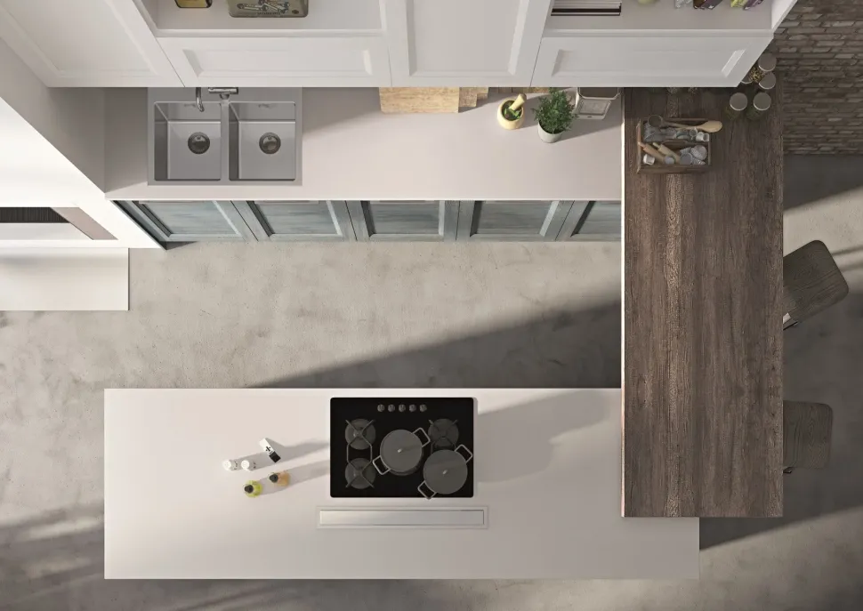 - Per potersi considerare uno spazio vivibile tutti i giorni, la zona cucina deve essere ben attrezzata, di fatto per Alba è disponibile una cappa a isola.