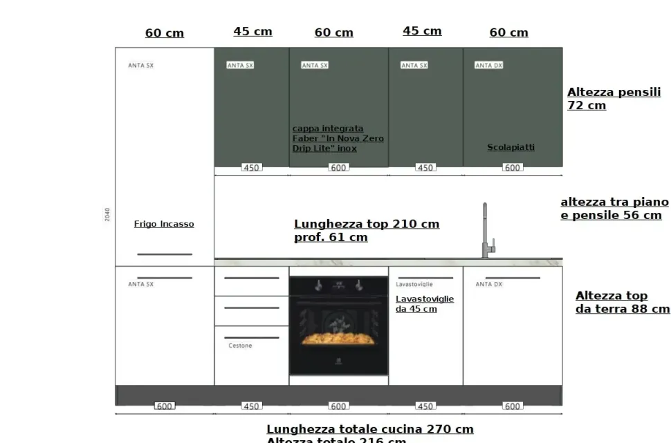 Dimensioni Cucina: cm L. 270 x H. 216 x P. 61-36