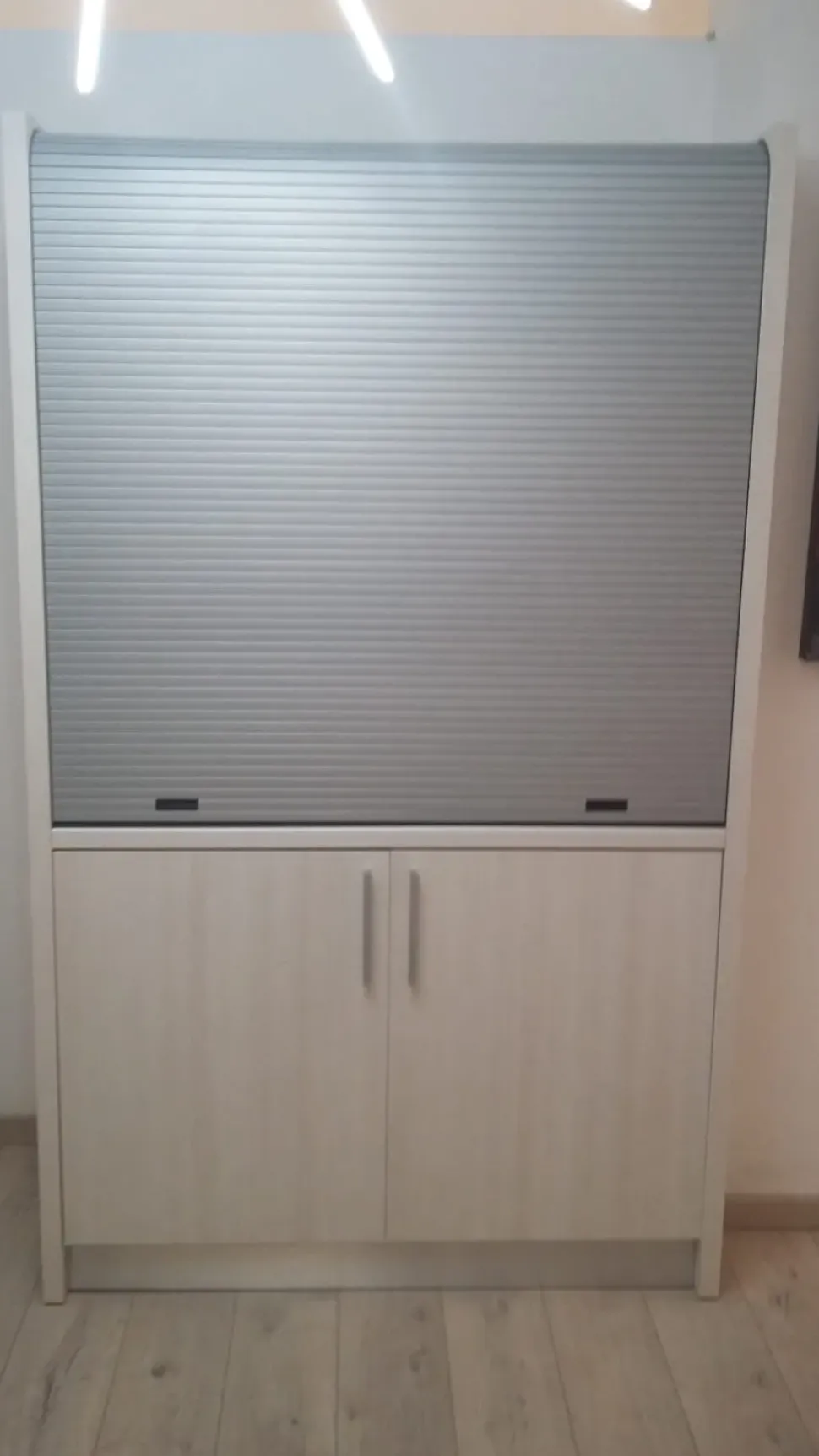 Serranda: In PVC, colorato grigio, completa di binario e fermo corsa.