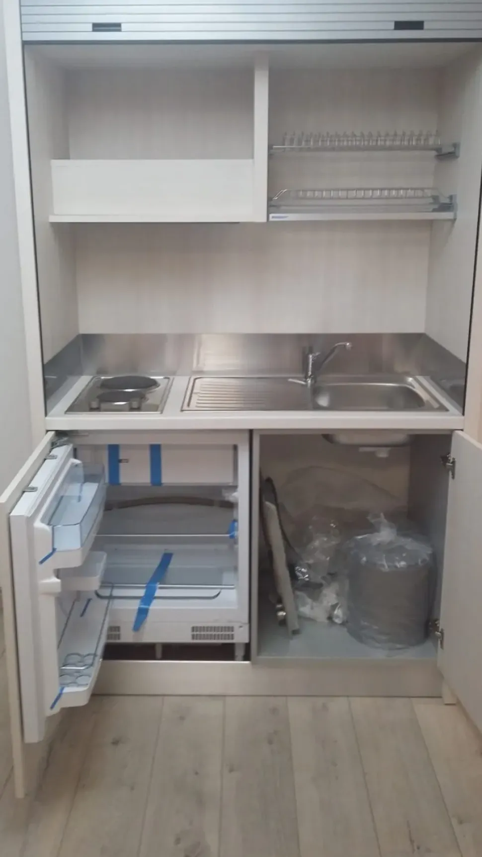 - Poiché la cucina Cucina monoblocco a scomparsa 102-k qui disponibile non prevede nessun forno, potrai averlo con un supplemento rivolgendoti direttamente a noi.