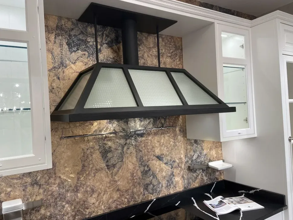Sicuramente particolare la cappa industrial realizzata in legno e vetro armato quadrettato da Marchi cucine che spezza la classica eleganza di una composizione luxury impreziosita da elettrodomestici top di gamma: