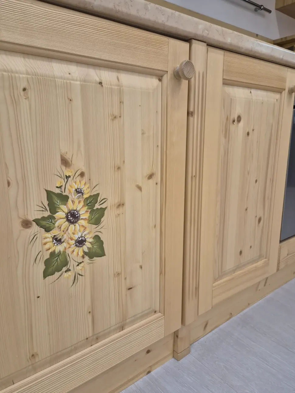 Cucina rustica lineare in abete spazzolato massello con decorazioni artigianali.