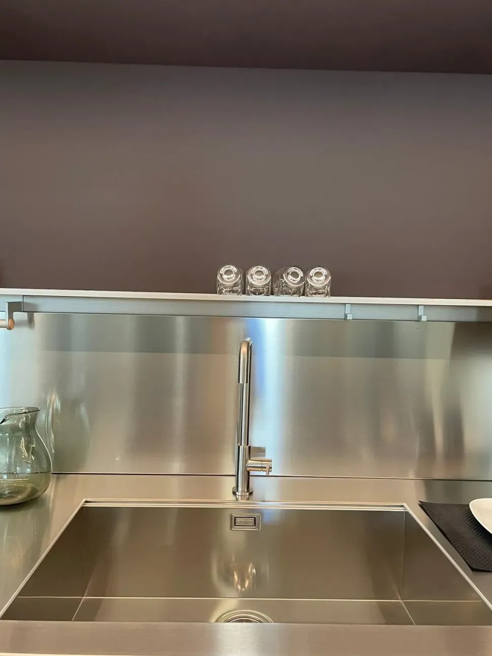 Tutte le ante in finitura fenix grigio chiaro piano in acciaio inox con lavabo vasca grande integrato.