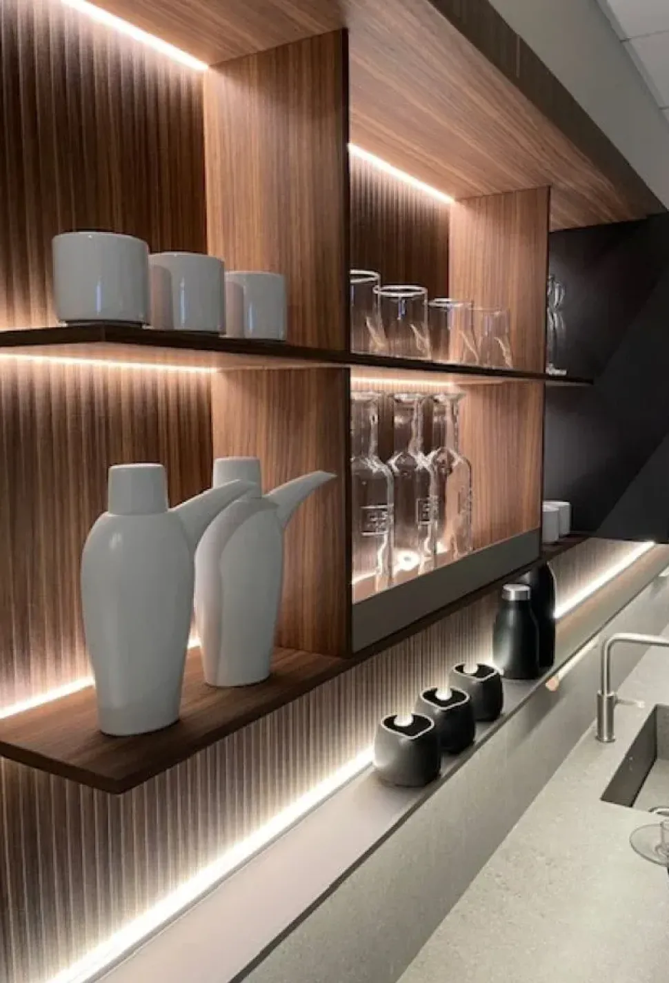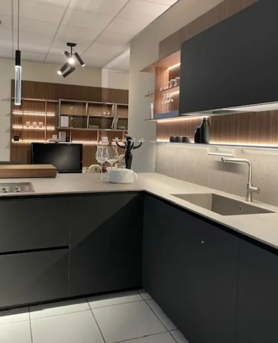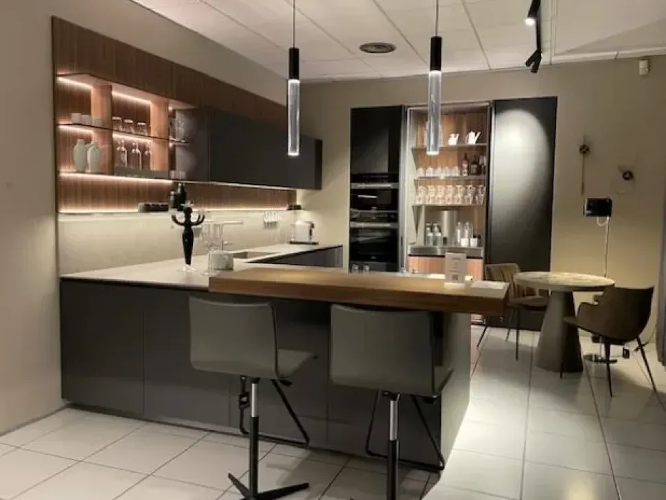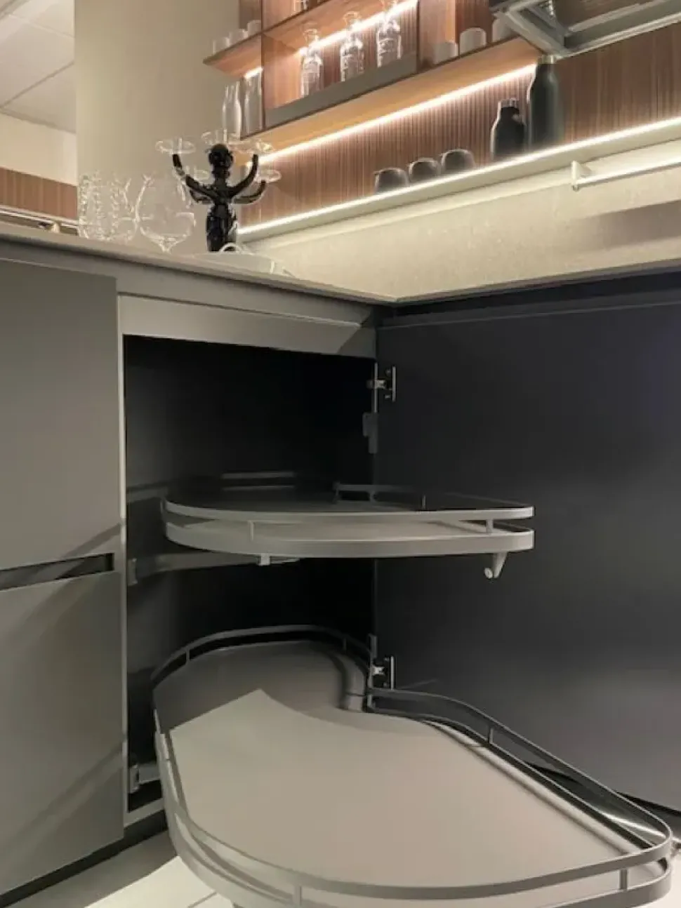 Qui presentata in finitura Fenix Grigio Etna colore esclusivo del brand Ernestomeda. Piano realizzato in pietra Cervino Tarmac Stone+ anch esso finitura in esclusiva, pensili a giorno, schienale boiserie, piano snack ed accessori, particolari realizzati in finitura Noce Canyon rigatino. Dettagli eleganti e raffinati in alluminio finitura Lucem, porta posate ed accessori interni in finitura dedicata ed esclusiva sempre in alluminio Lucem.
