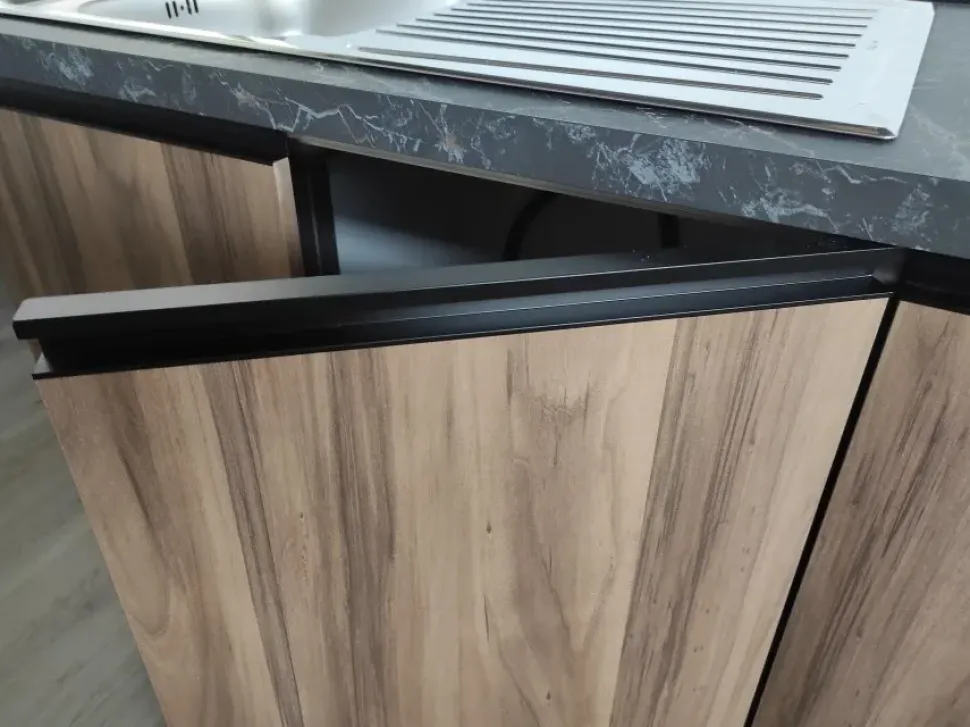 Anta in nobilitato con rivestimento in melaminico, spessore 18 mm. Maniglia integrata nel colore nero ossidato sul bordo superiore dell anta. Bordatura sui 4 lati in ABS antiurto, spessore 1 mm. nel colore del frontale.